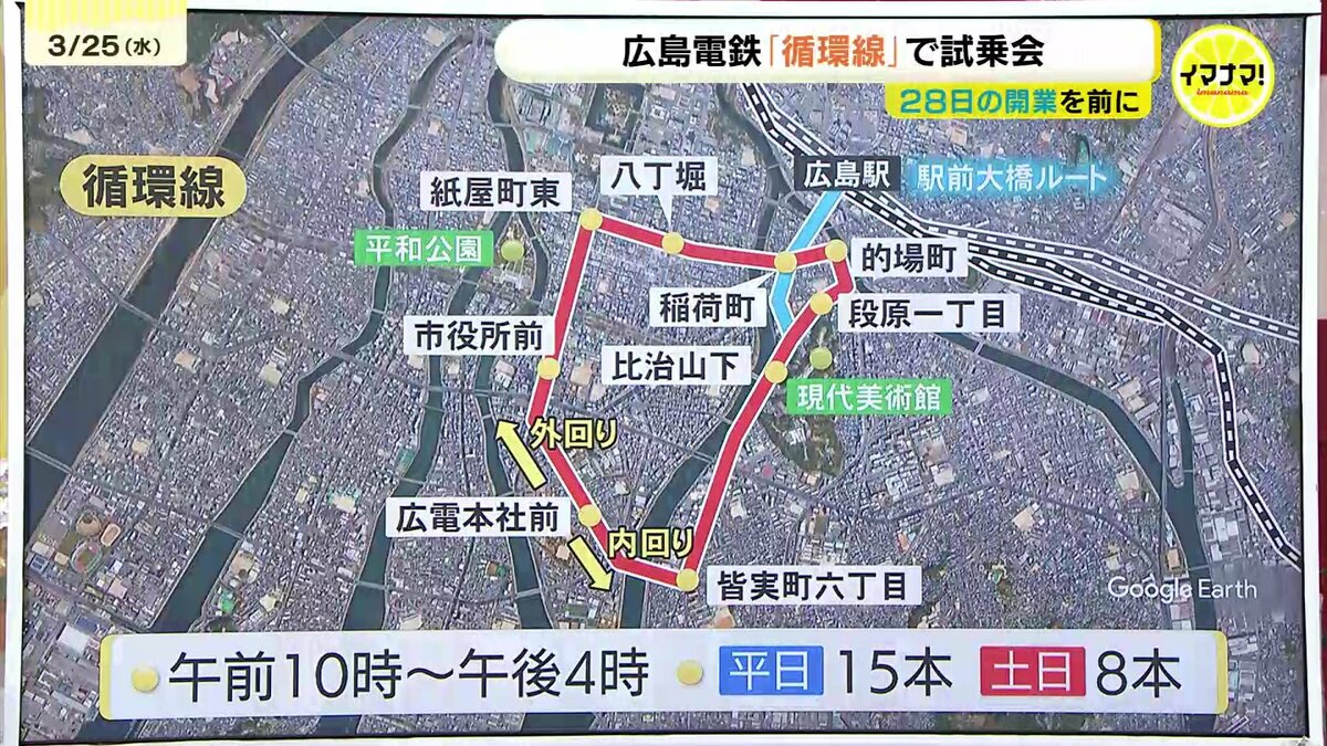 28日開業の循環線は一周が約45分です。千田地区の「広電本社前」を起点に、午前10時から午後4時までの間、外回りと内回りが平日は15本、土日は8本ずつ運行されます。