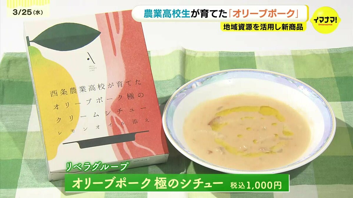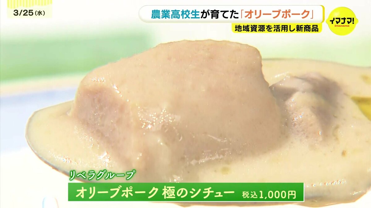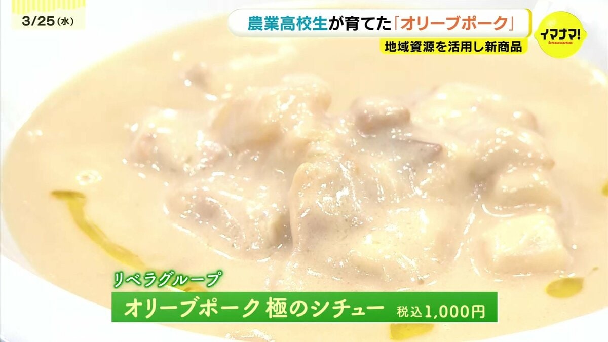 「オリーブポーク極のシチュー」は税込1000円。オリーブの絞り粕を混ぜることで、ブタの肌ツヤが良くなり、肉質が改善したといいます。クリームシチューは、アバンセ・江田島市のオリーブファクトリーなどで販売されています。