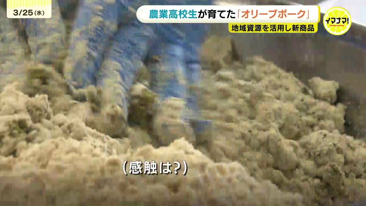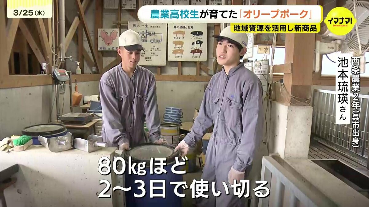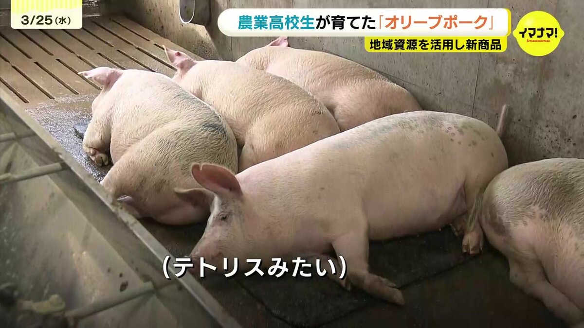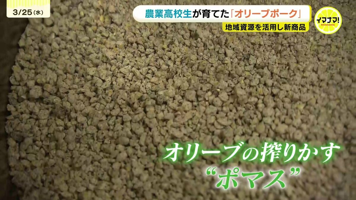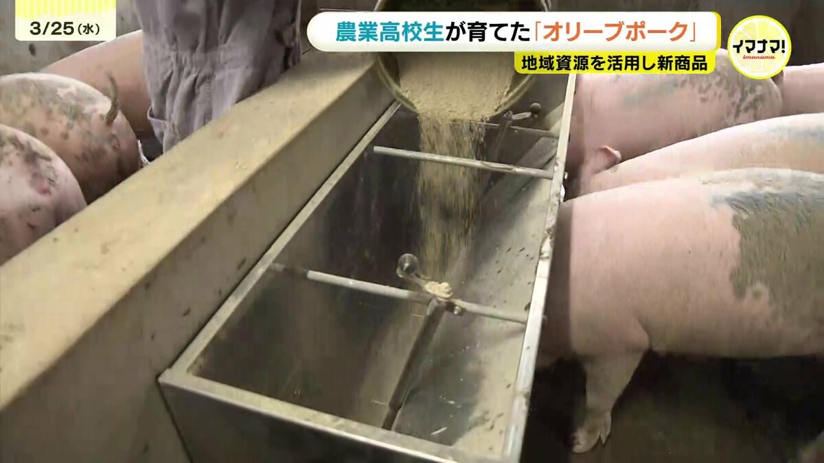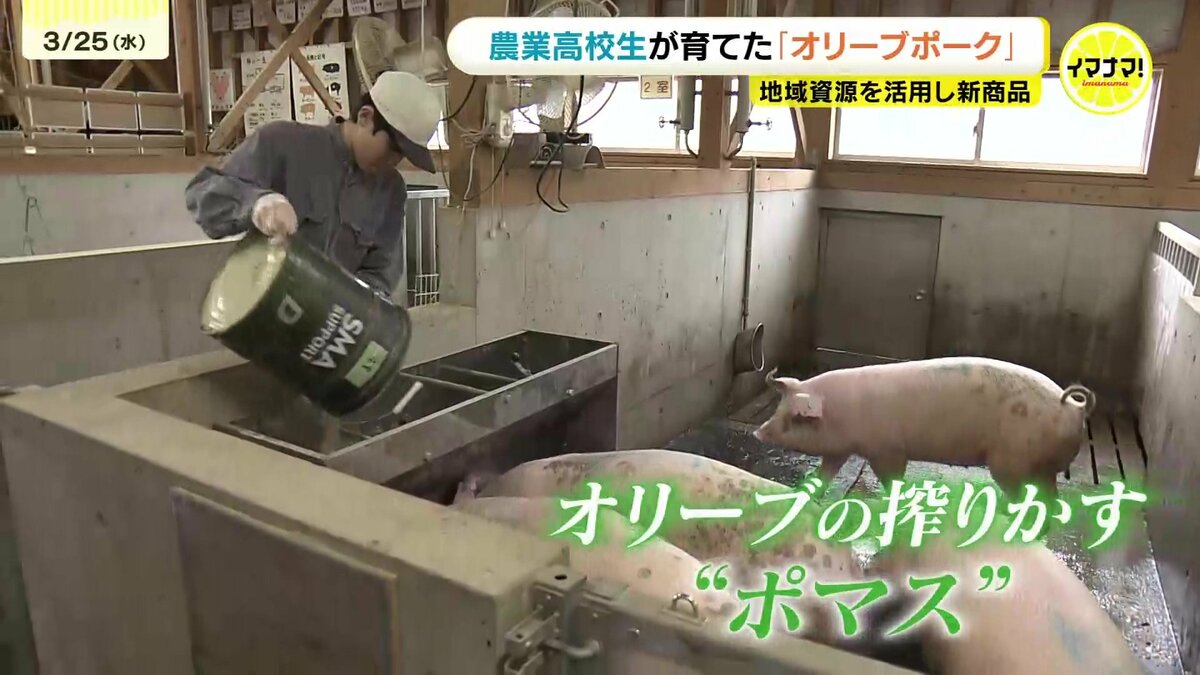 西条農業高校にある豚舎では、20頭あまりのブタが飼育されています。生徒たちが当番制で毎朝与えているのが、オリーブの搾りかす「ポマス」を混ぜたエサです。