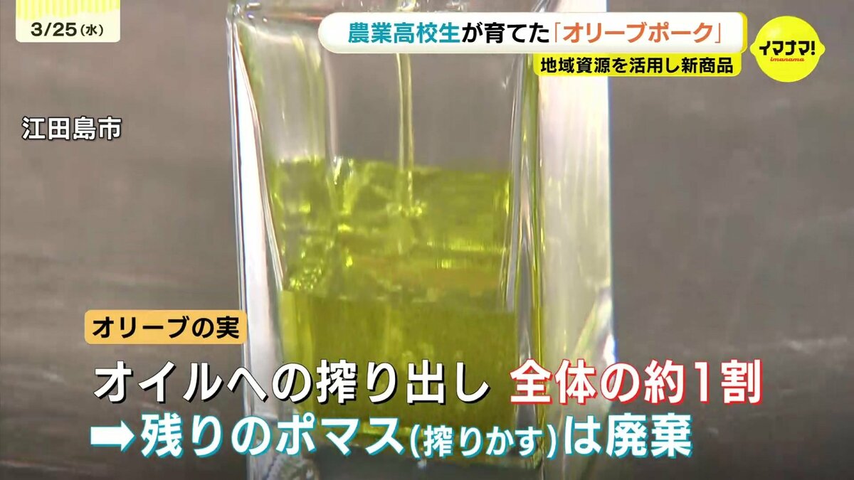 オリーブの実から絞り出せるオイルは、約1割ほどしかありません。これまで残った大量のポマスは廃棄されてきましたが、4年前、当時の生徒たちが江田島市でオイルを生産する「リベラ」と連携。栄養たっぷりのエサを開発しました。