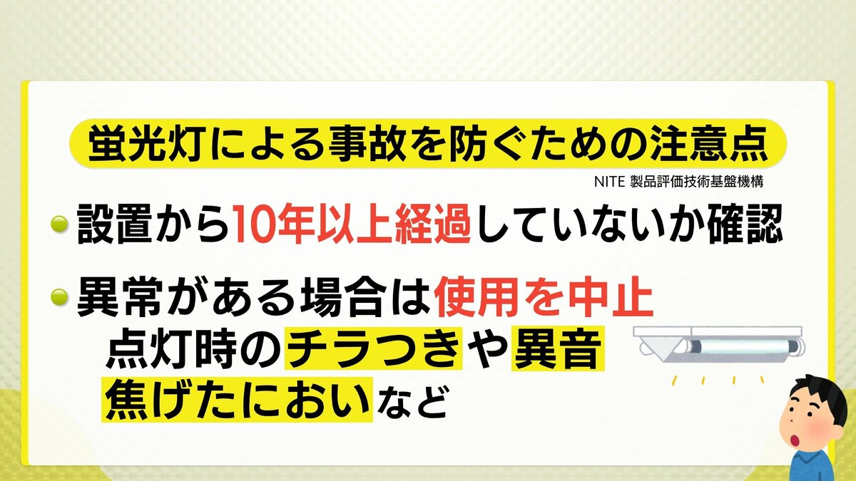 NITEは、使用年数が10年以上の場合は、蛍光灯器具ごとの交換を検討するよう呼びかけています。