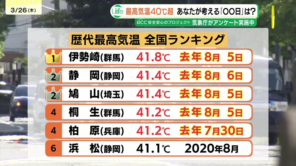 災害級の暑さは、全国で厳しさを増しています。去年、歴代の最高気温・トップ5が、全て塗り替えられ、かつてない過酷な夏となりました。40℃以上の暑さにどう警鐘を鳴らすのか。アンケートは今月29日まで実施されます。