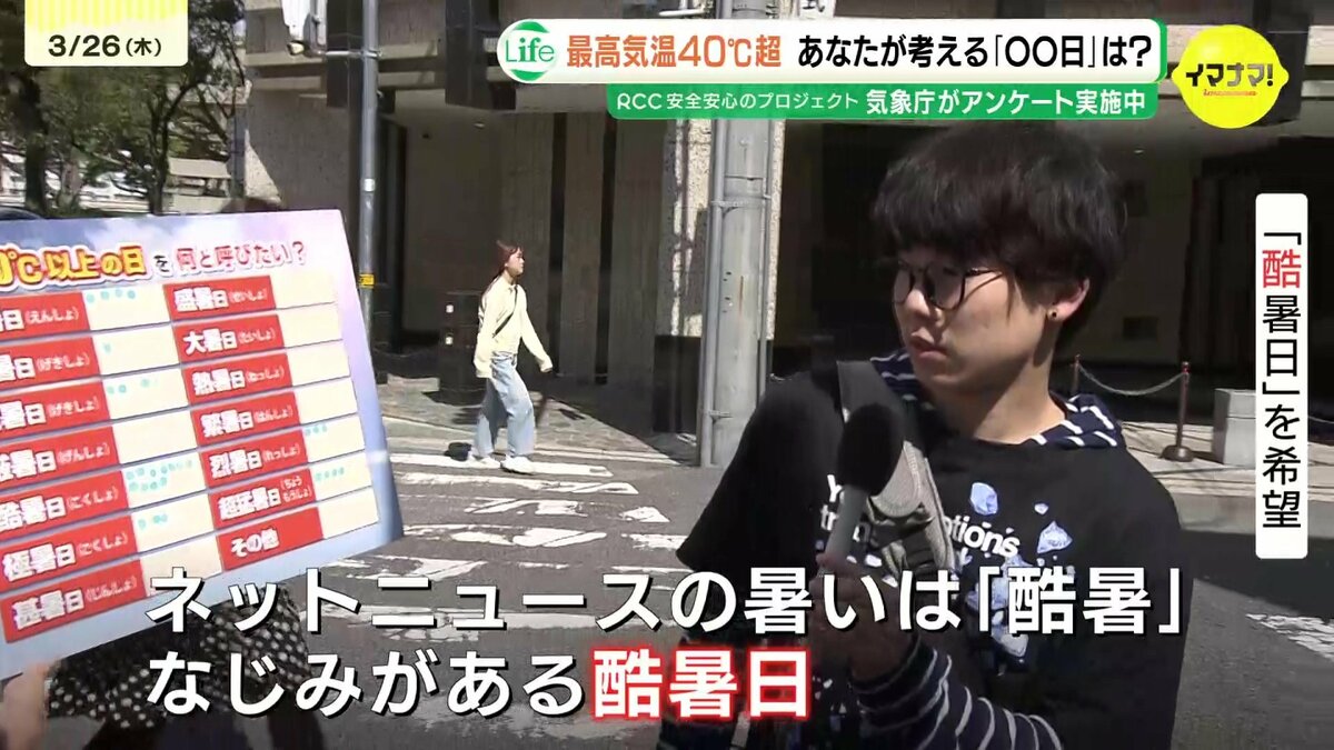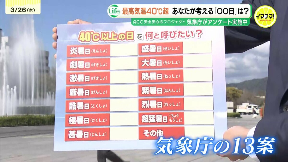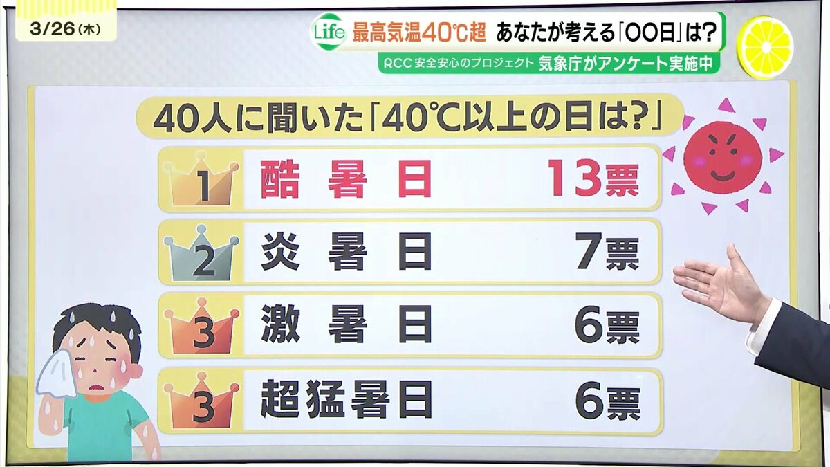 番組が独自に街の人40人に聞いたところ、13票を集めて第1位となったのは「酷暑日」でした。
