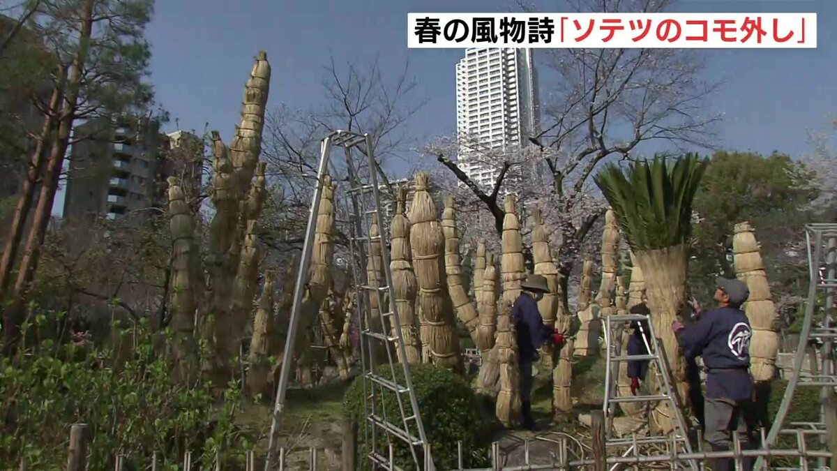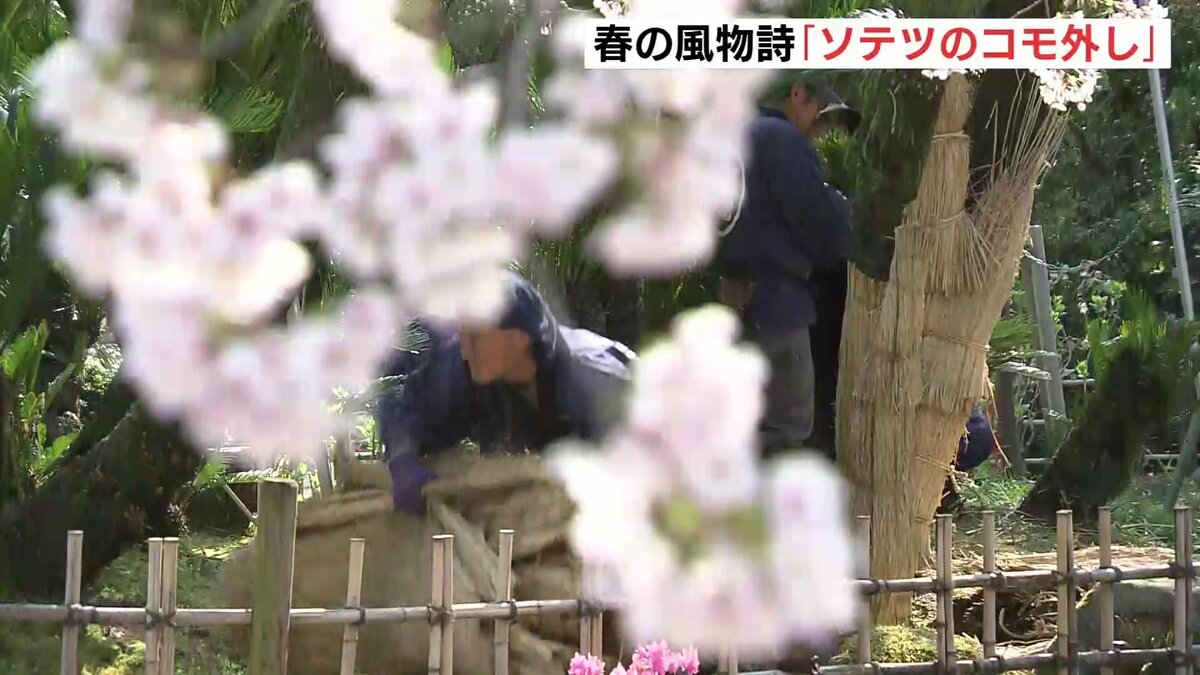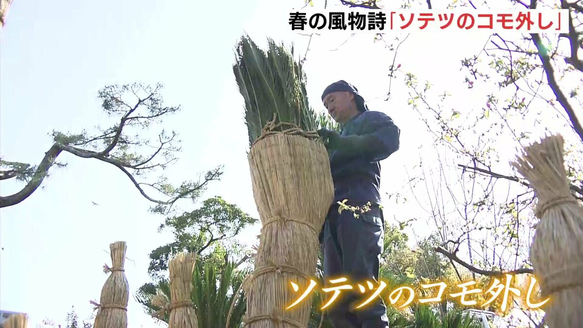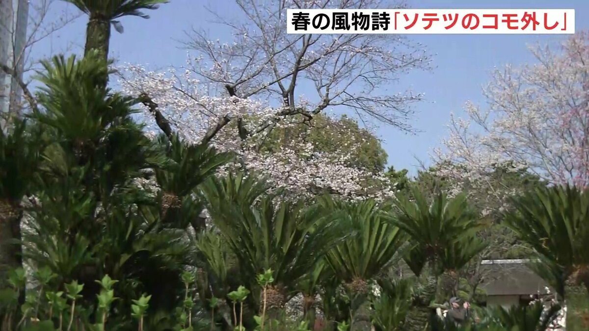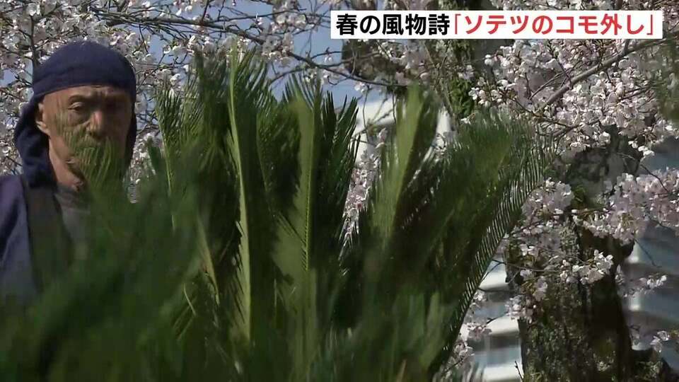 例年に比べ1週間ほど、遅れて行われたコモ剥がし。間もなく満開を迎えるサクラに囲まれる中、37本のソテツは青々とした葉を大きく広げ、太陽の光を浴びていました。