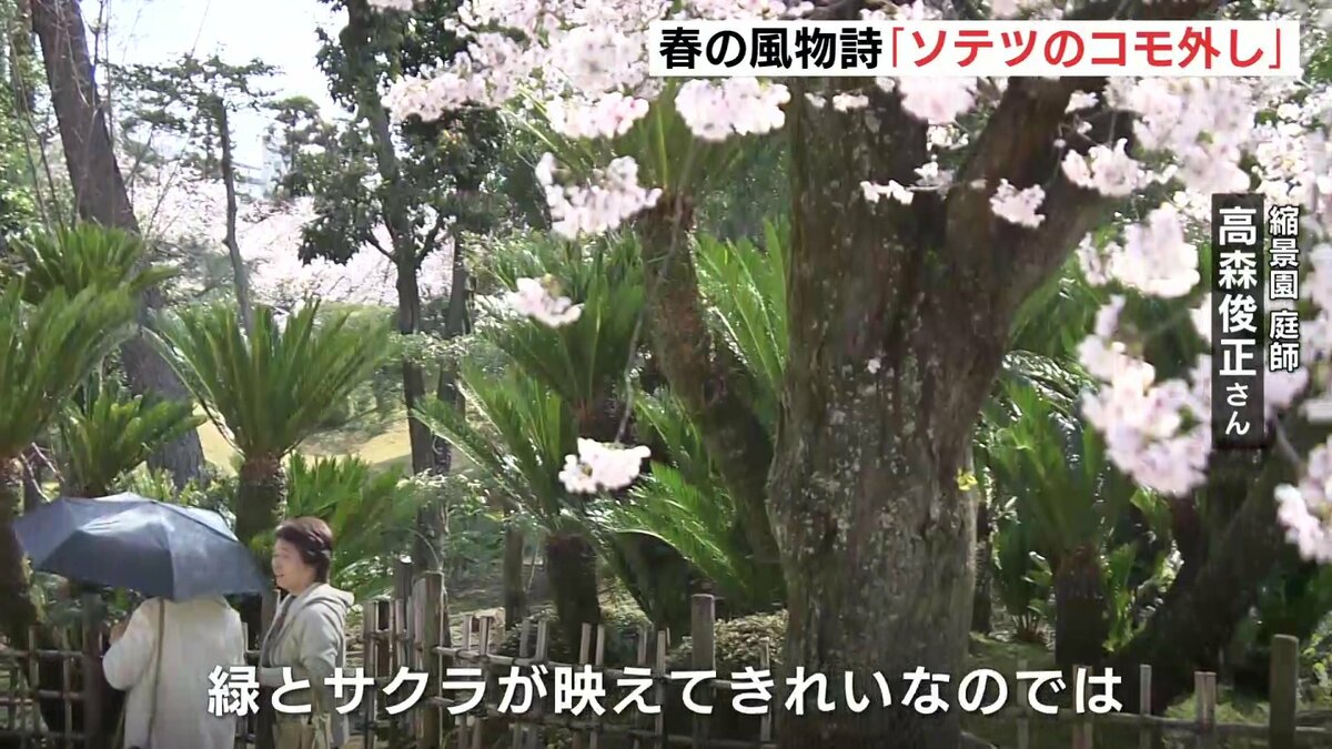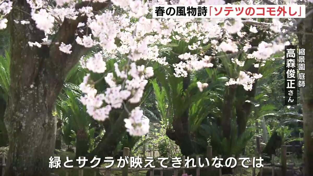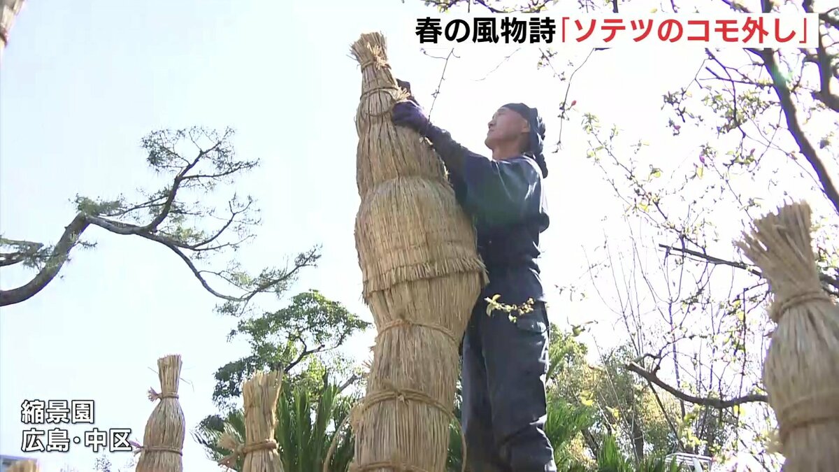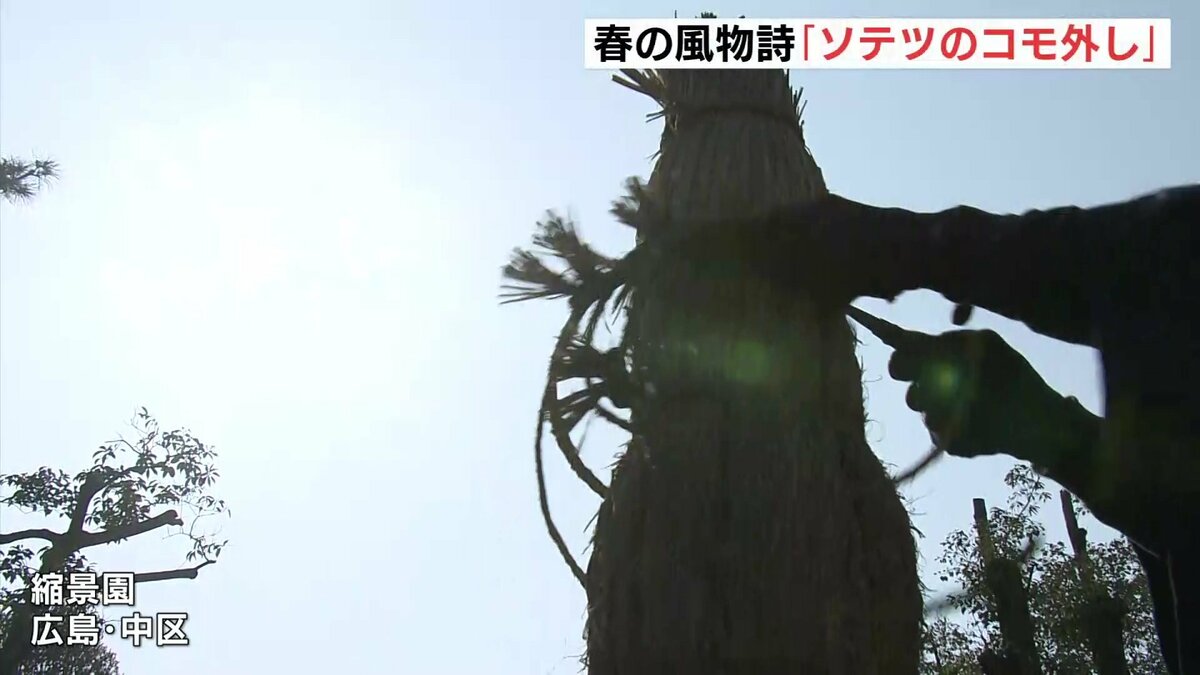 あたたかい日差しに包まれたけさの広島市。縮景園のソテツ園では、コモ外しが行われました。