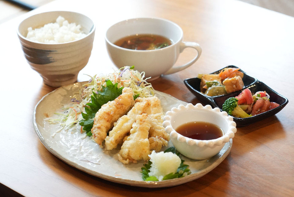 金曜は、地元野菜を使った副菜付の「KATYランチ(1,300円)」。魚か肉のどちらかで選べ、この日のメインは鶏ささみ天。