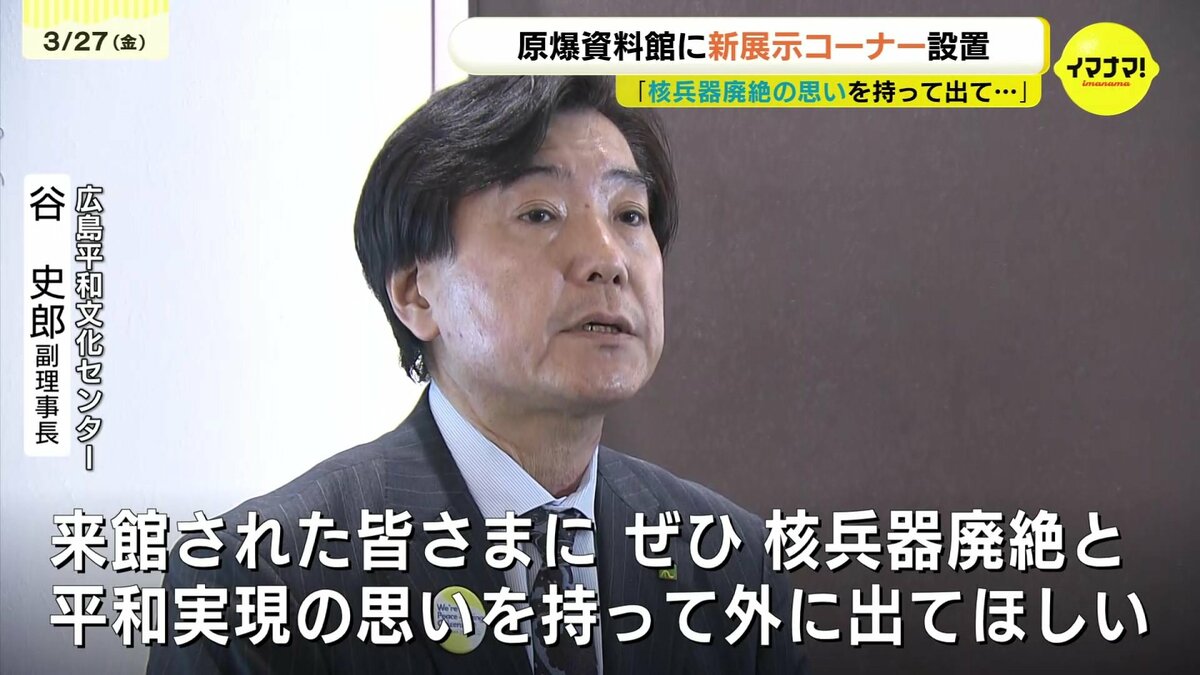 新コーナー「ヒロシマは訴える」は、東館1階の見学動線の最後に設けられました。広島平和文化センターの谷史郎副理事長は「来館された国内外の皆様にぜひ核兵器廃絶と、平和実現への思いを持って外に出ていただきたい」とその理由を話していました。