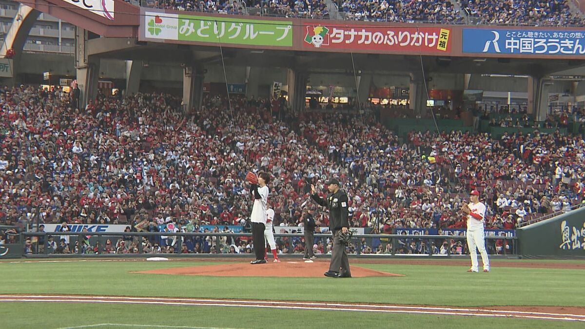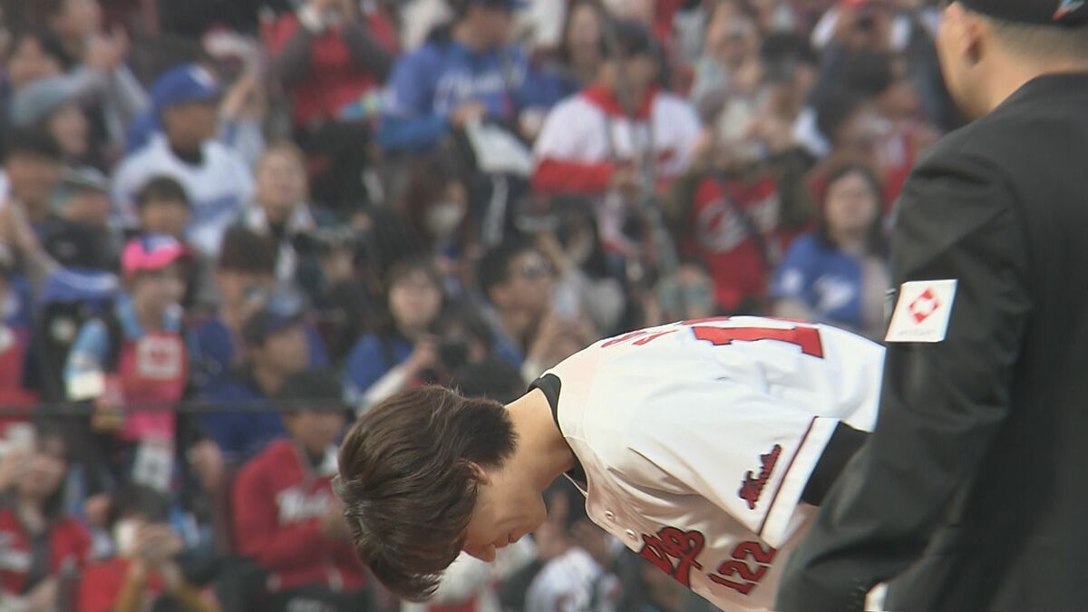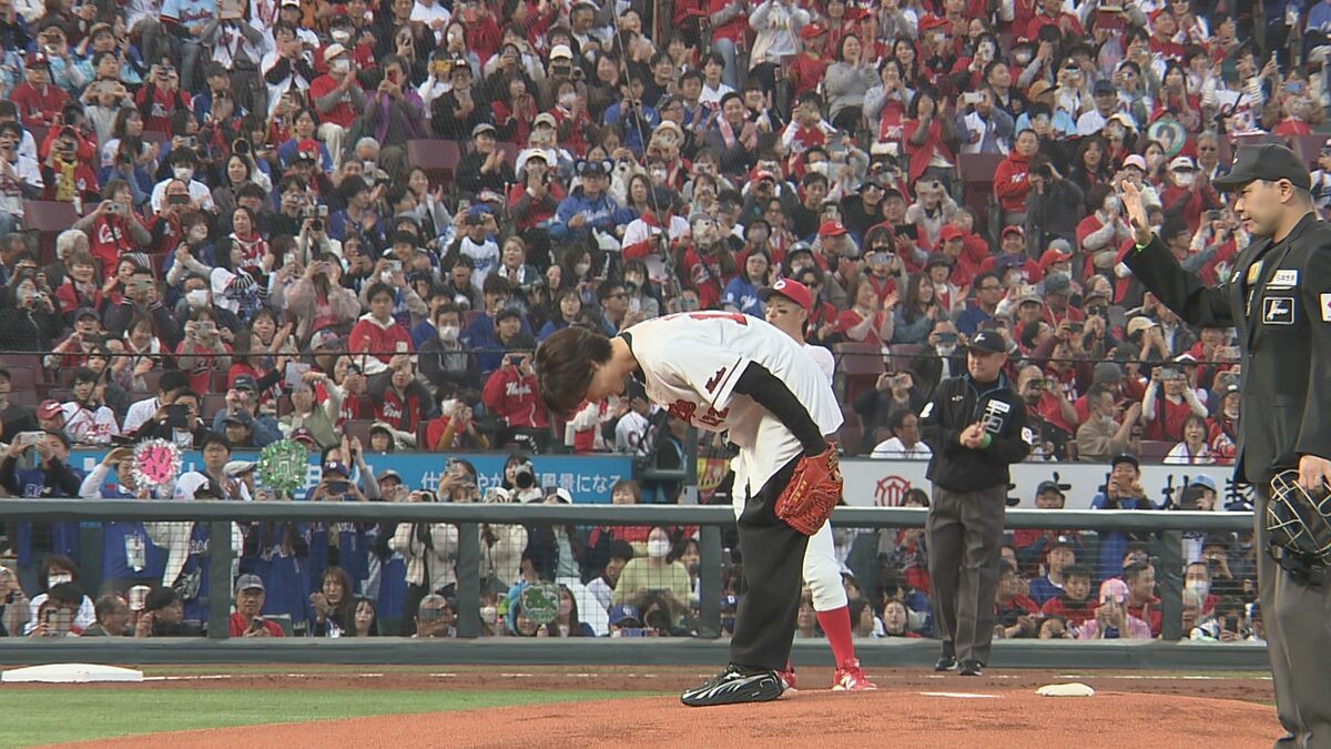 1塁側、3塁側、センター、ホームに4回、深々と礼をしてからセットポジションに入ると、しなやかなフォームから放たれたボールは見事な放物線を描き、キャッチャー・坂倉選手のミットへ一直線!