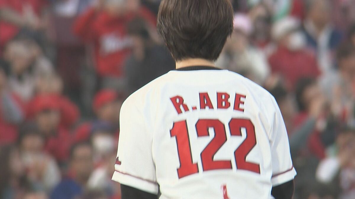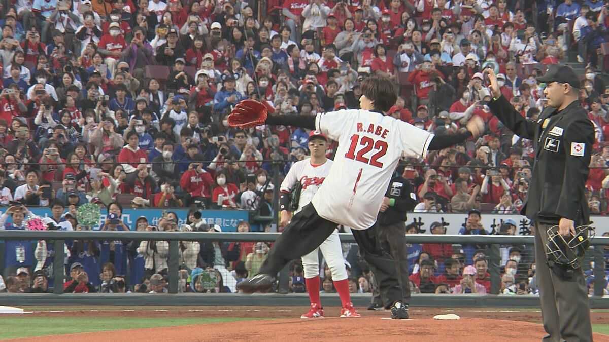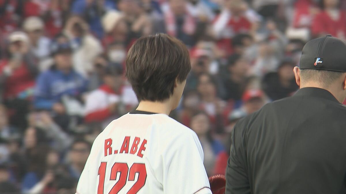 阿部さんは、背番号「122」のカープユニフォームに身を包み、マウンドへ。