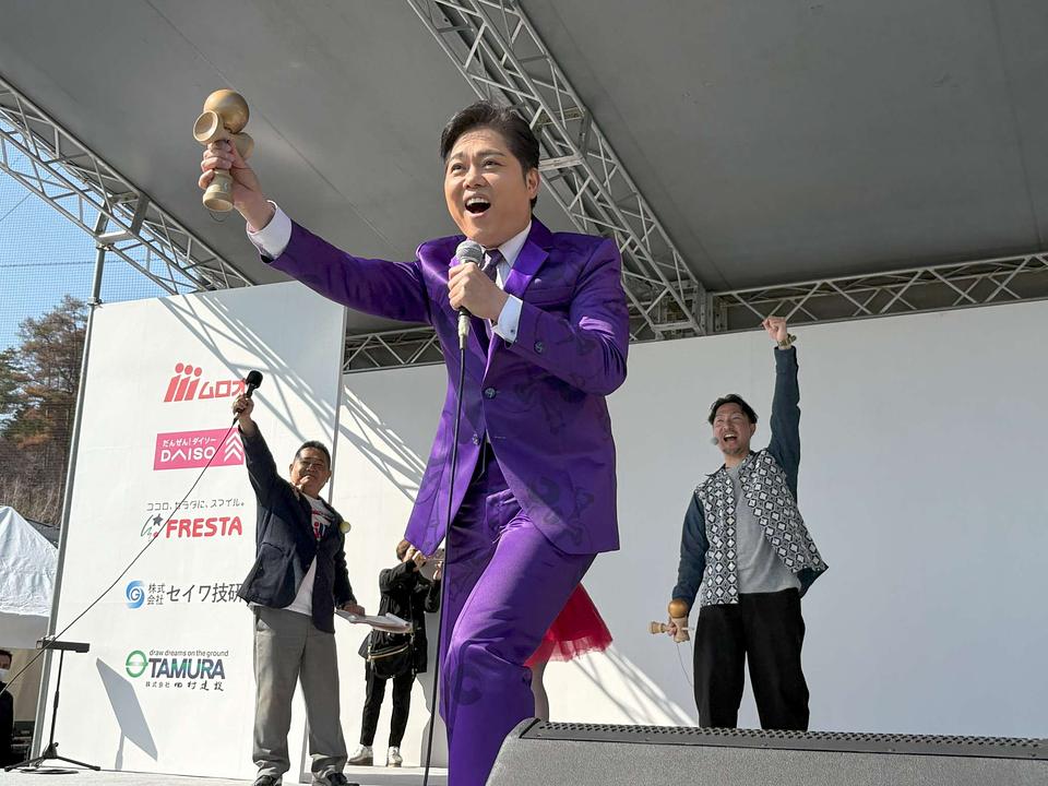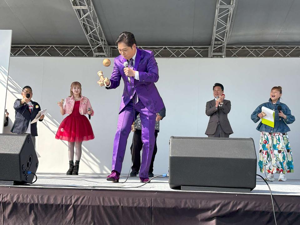 ステージには、けん玉大使としても知られる演歌歌手の三山ひろしさんが、けん玉柄の鮮やかな紫色のスーツ姿で金色のけん玉を手に登場。紅白歌合戦での経験を交え、「鼻で息を吸って脳みそに酸素を送り、玉に息をかける」というメンタル管理のアドバイスを披露し、会場を沸かせました。