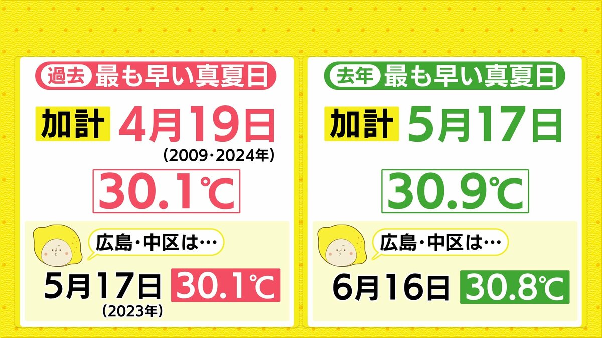 過去最も早い真夏日は、30.1℃を記録した加計(2024年・2009年)の4月19日ですが、ことしは高温傾向が予想されているため、4月後半から真夏日を記録する可能性があります。ことしも春は短く、早々に暑い夏が到来する見込みです。