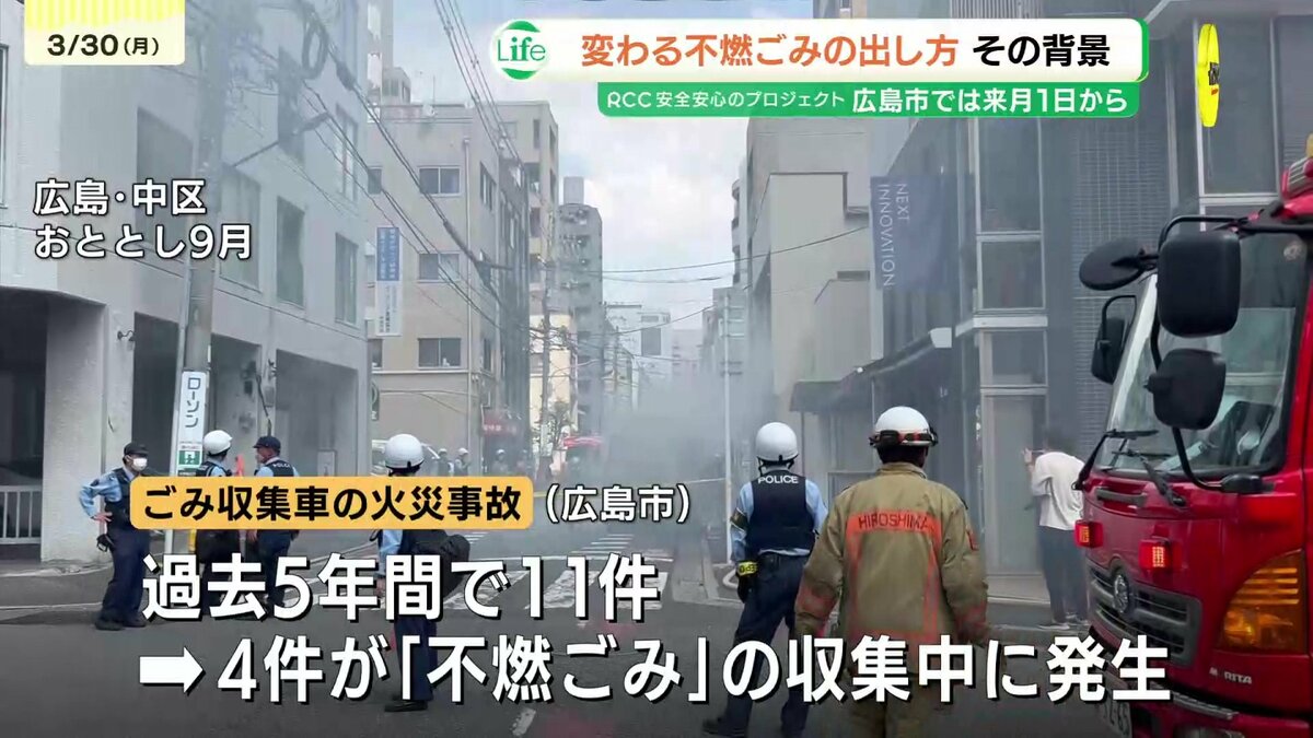 広島市のごみ収集車の火災事故は、過去5年間で11件。このうち4件が「不燃ごみ」の収集中に発生しています。