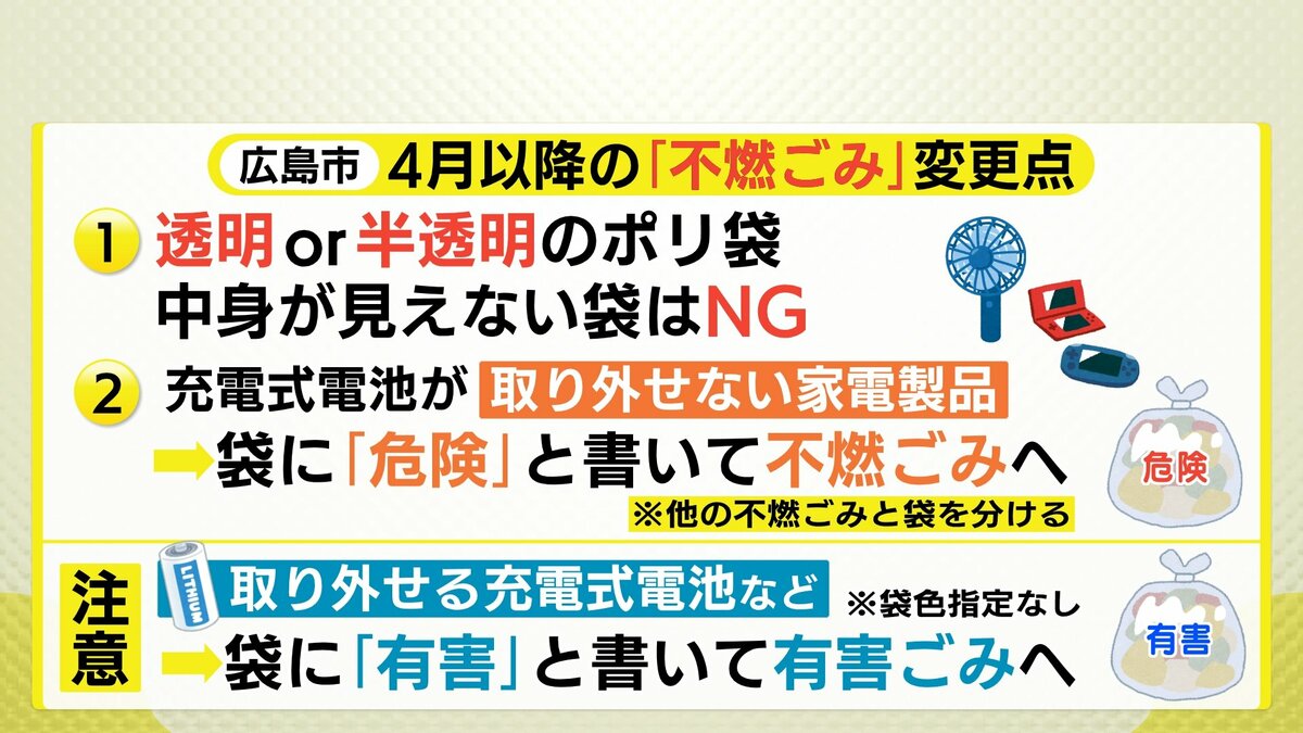 広島市の不燃ごみの出し方が4月から変わります。黒など中身が見えない袋では、収集してもらえなくなり、透明や半透明の袋が必須になります。背景には、充電式電池などによる火災リスクの高まりがあります。