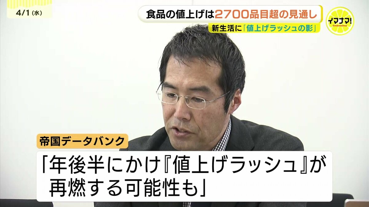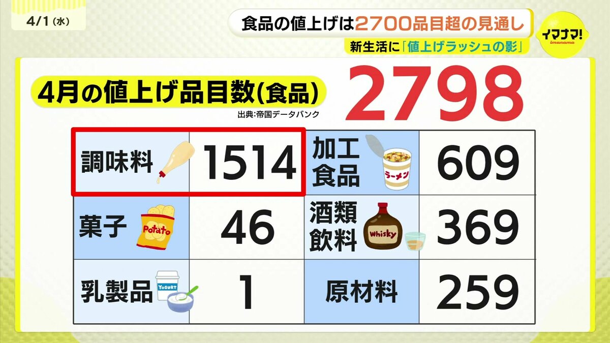 4月1日から新年度を迎えましが、新生活に値上げラッシュの影です。今月の食品の値上げは、調味料や加工食品を中心に2700品目を超える見通しであることがわかりました。