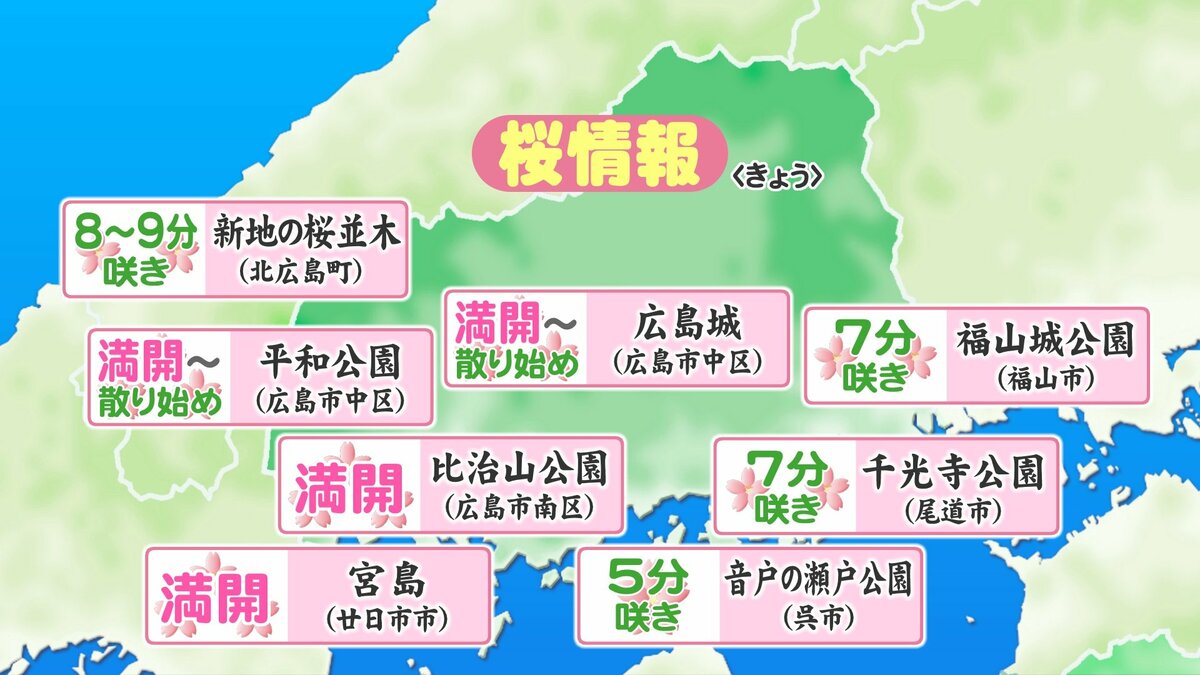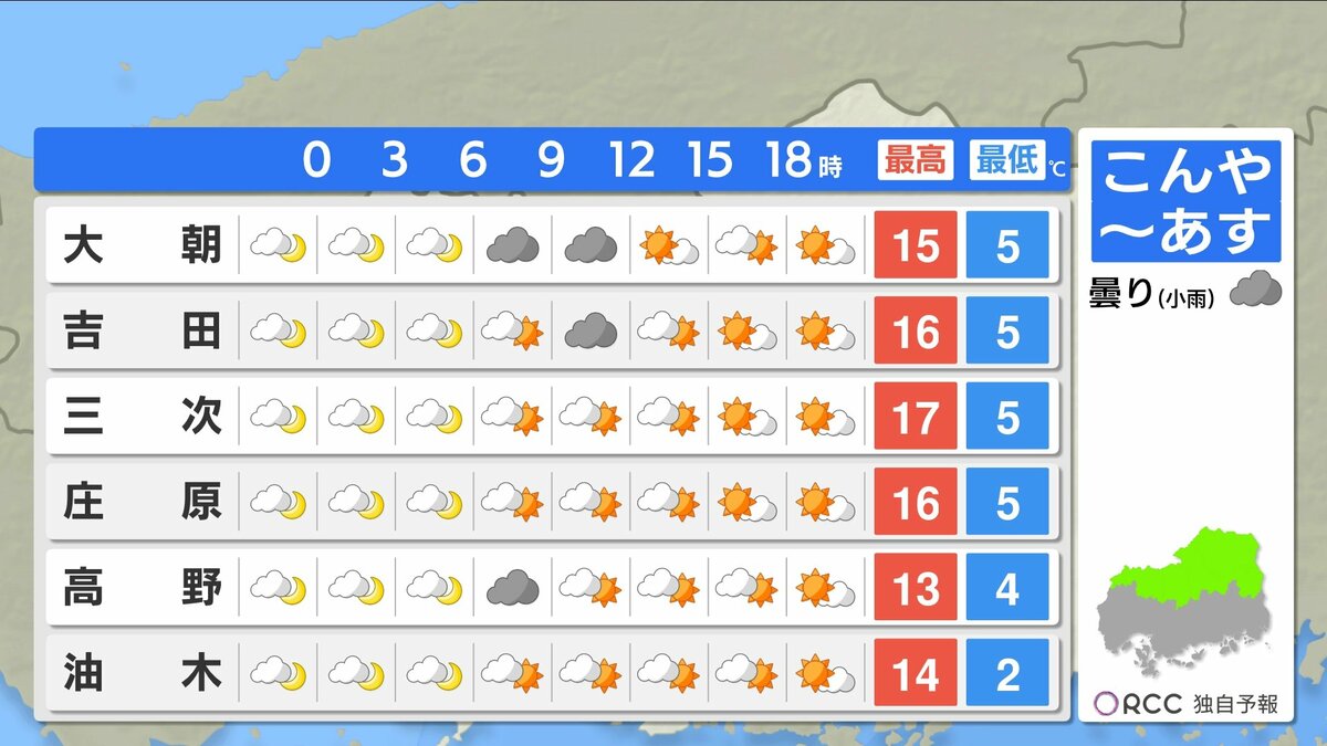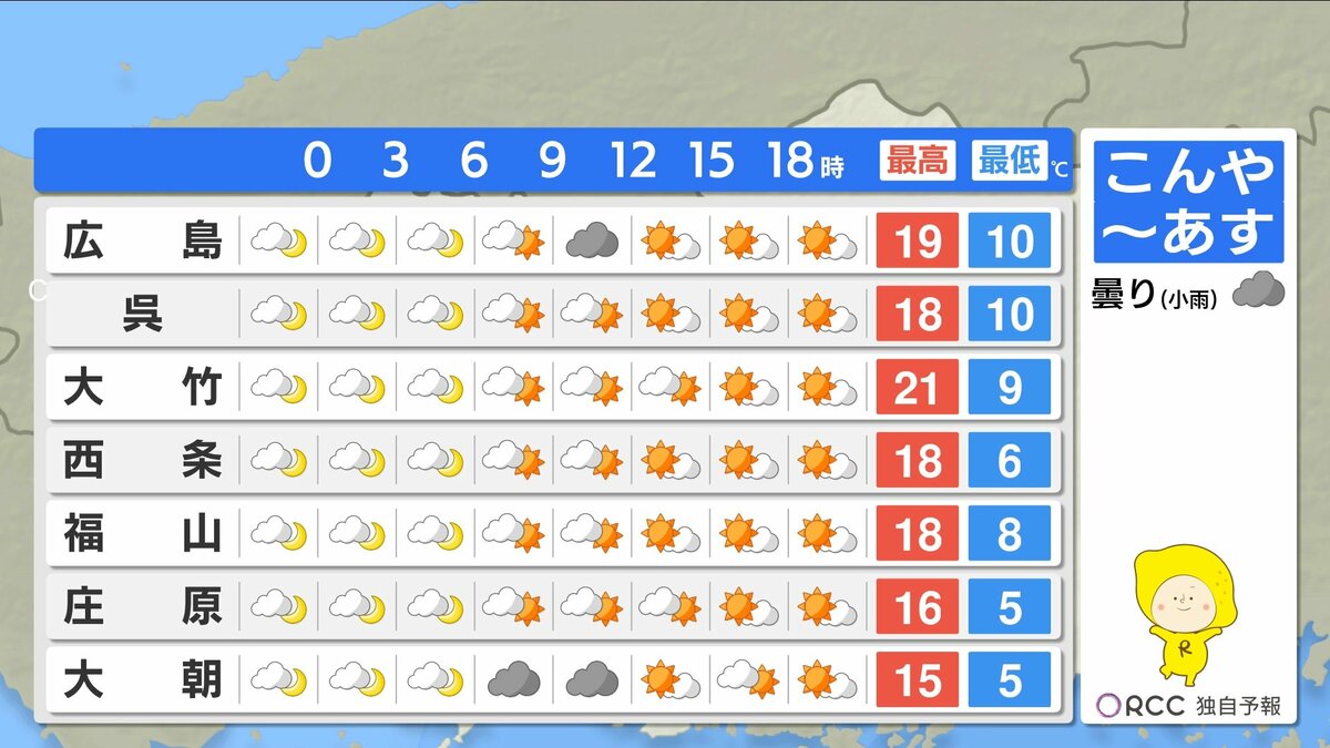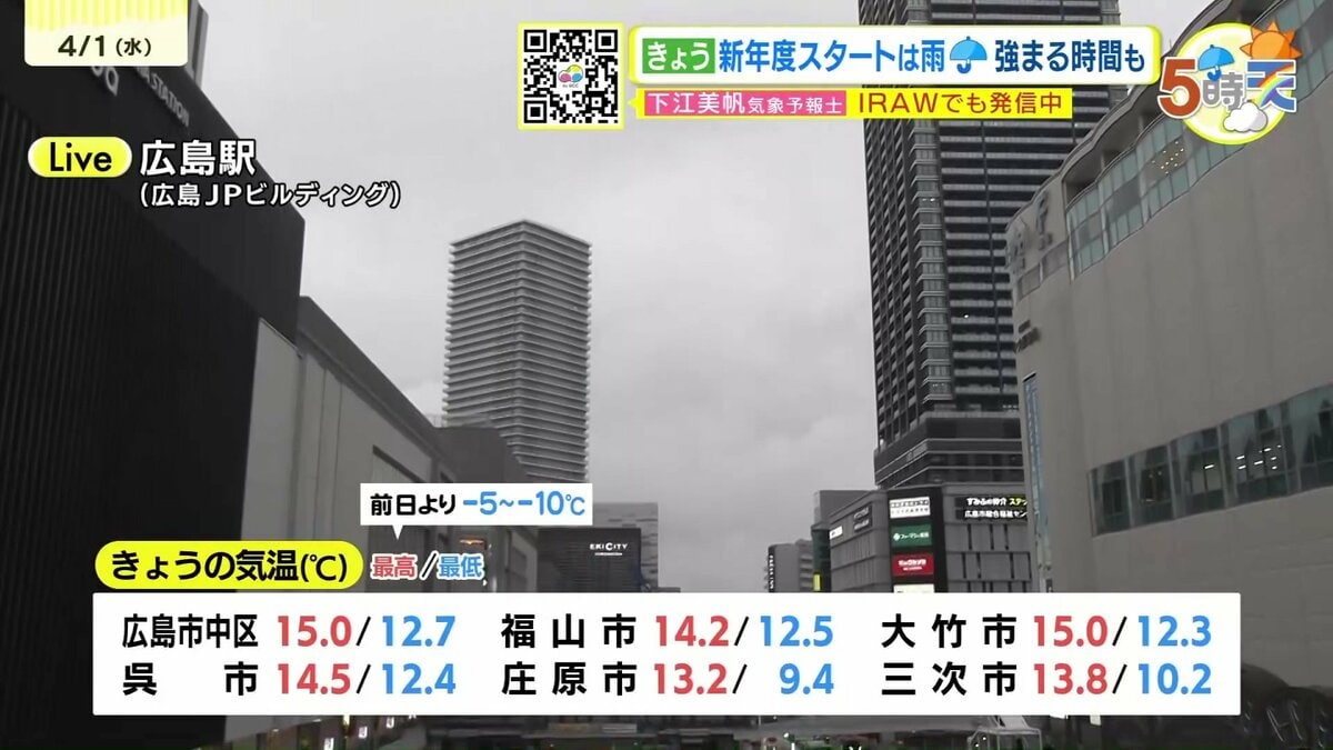 きょう4月1日(水)の広島県内は、明け方から雨が降り、昼前からは降ったりやんだりでした。新年度は雨のスタートとなりました。日中の気温は、広島市中区や大竹で15℃など、きのうと比べると5℃~10℃ほど低くなりました。