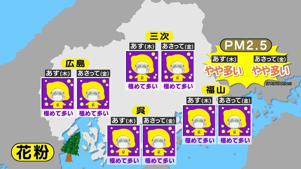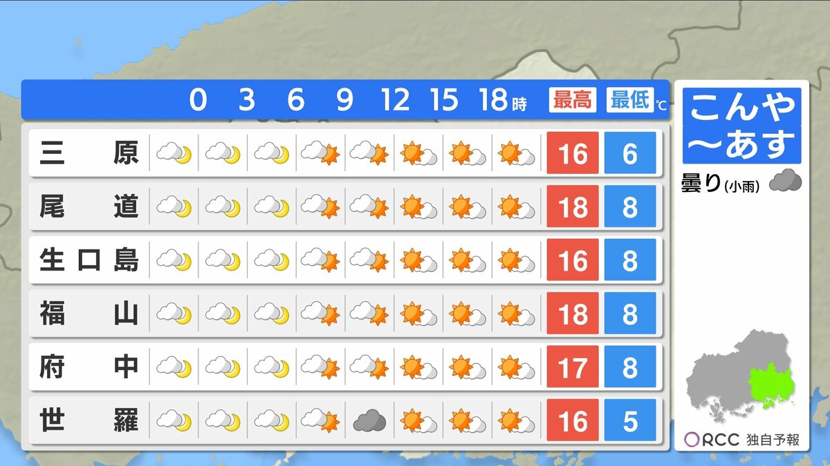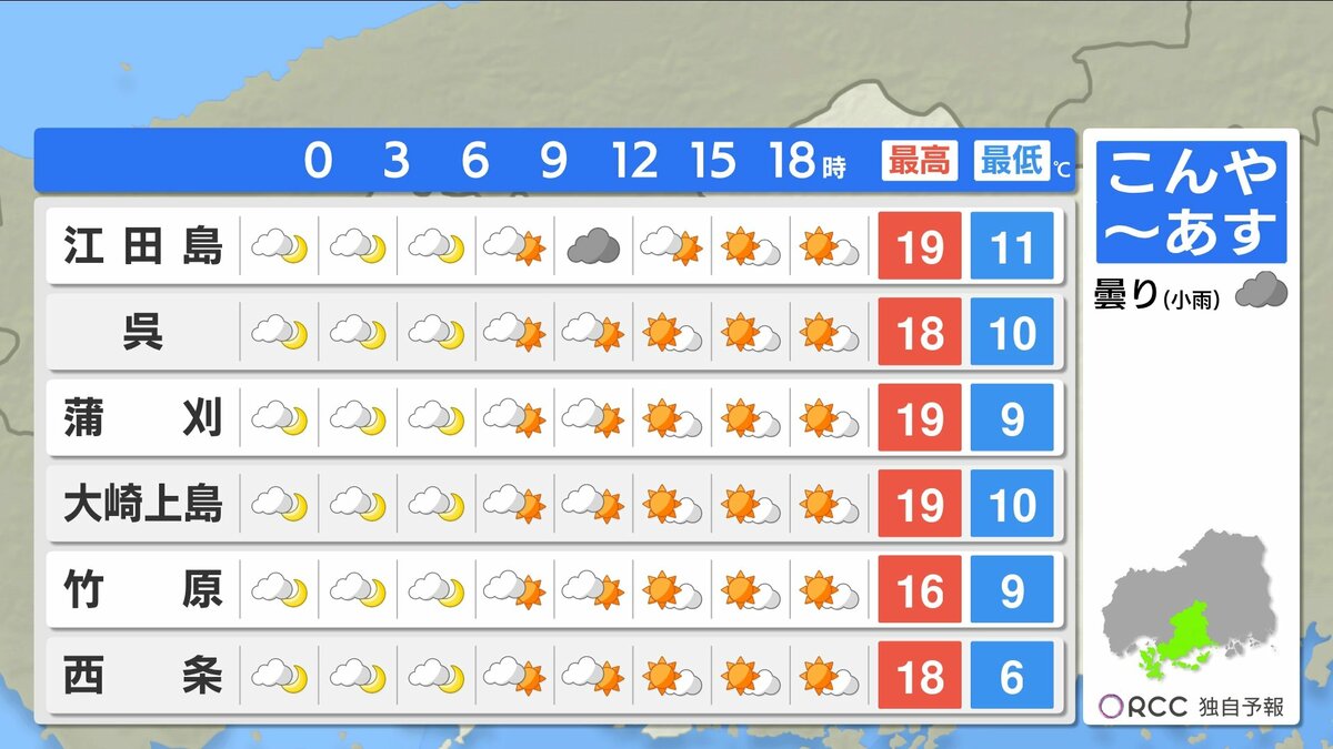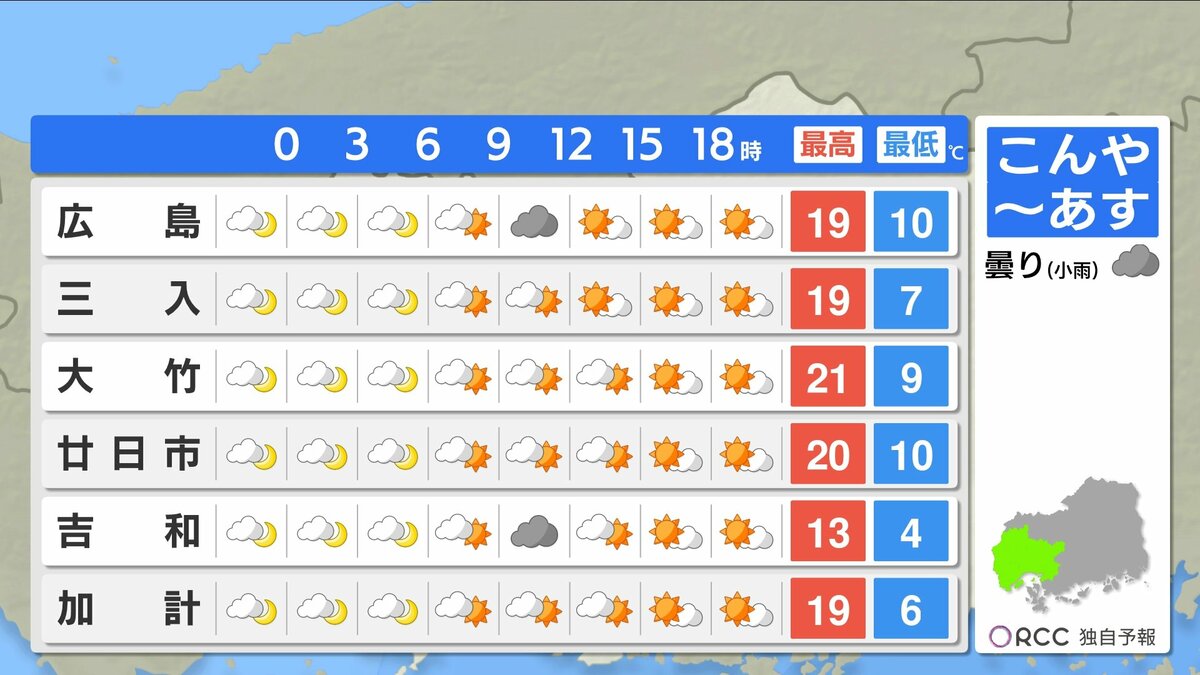 きょう4月1日(水)の広島県内は、明け方から雨が降り、昼前からは降ったりやんだりでした。新年度は雨のスタートとなりました。日中の気温は、広島市中区や大竹で15℃など、きのうと比べると5℃~10℃ほど低くなりました。