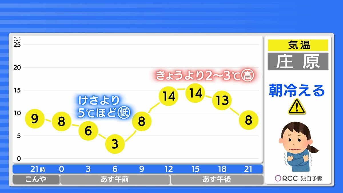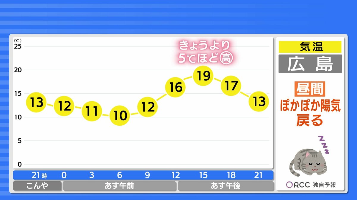 最低気温は、北部や内陸部ではけさより5℃ほど低くなるでしょう。日中の気温は、きょうより5℃以上高くなる地点が多く、昼間はぽかぽか陽気が戻ってくる予想です。日中は上着いらずの暖かさになるでしょう。