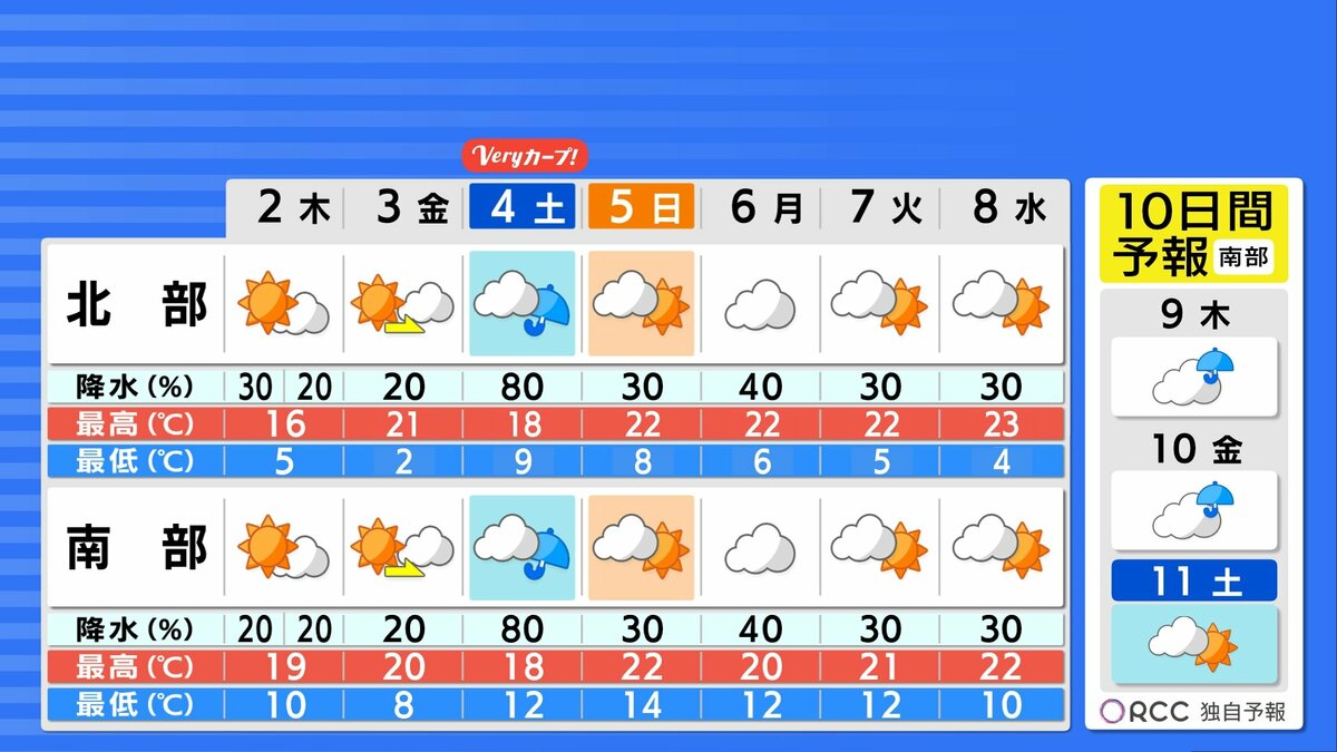 あす、あさっては晴れ間が広がりますが、土曜日は前線上の低気圧が発達しながら本州付近を通過するため再び大きく天気が崩れ、まとまった雨が降るでしょう。雨風強まる時間帯がある見込みです。春本番の陽気が続き、昼間は上着いらずの暖かさが続くでしょう。南部では朝晩の冷え込みも緩んできますが、北部や内陸部では晴れると朝晩と日中との寒暖差が大きくなります。脱ぎ着しやすい服装でお過ごしください。