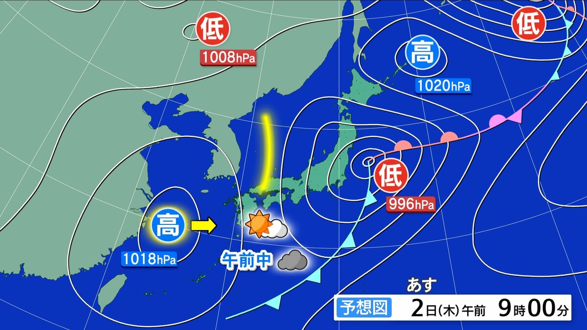 高気圧が本州付近に近づき、あすは天気回復し晴れ間が広がるでしょう。午後ほど高気圧に覆われ雲が少なくなる予想です。ただ、気圧の谷が通過するため、昼前はごく狭い範囲でにわか雨の可能性があります。