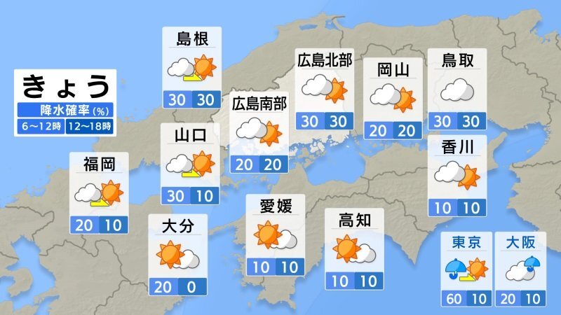 きのう天気を崩した前線や低気圧は東へと進み、この後はゆっくりと回復してくる見込みです。ただ、上空の高いところには寒気が残っていて、大気の状態が不安定になりやすくなっています。きょうは日差しがあっても、急なにわか雨にご注意ください。山沿いでは雷を伴うところもあるでしょう。最高気温は、広島19℃、呉・福山18℃、庄原18℃の予想です。