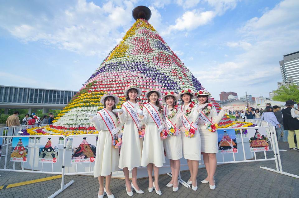 花の塔は、カーネーションやペチュニアで飾られた高さ8m直径9m