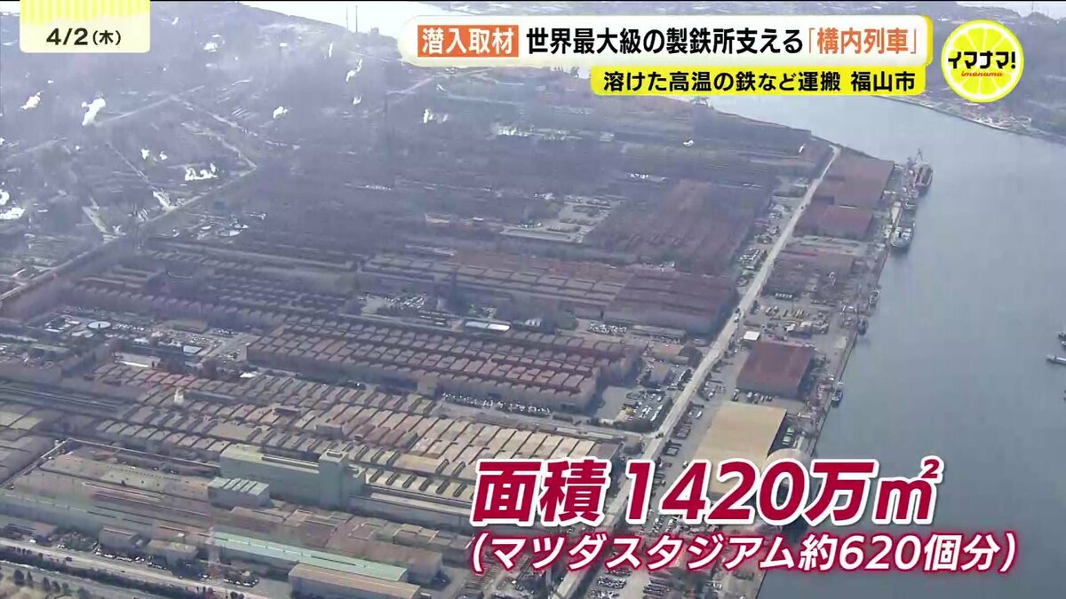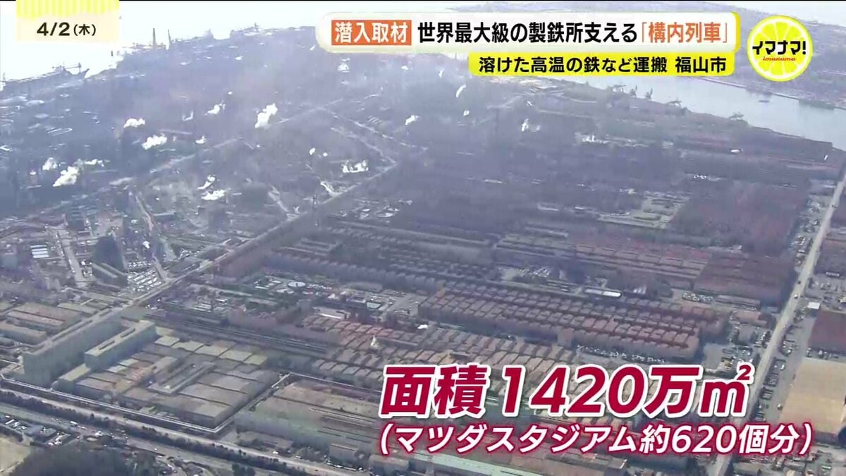 広島県福山市にある、JFEスチール西日本製鉄所福山地区。面積は1420万㎡。マツダスタジアム約620個分に当たり、世界最大級です。今回、特別な許可を得て、その敷地内で取材しました。