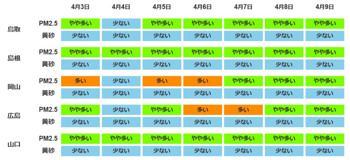 また、SPRINTARS開発チームによると、3日(金)以降は、中国地方でPM2.5が多いところもある予想です。PM2.5や黄砂が多い日には、花粉症の症状が重くなることもあります。アレルギー体質の方は対策をしてお過ごしください。
