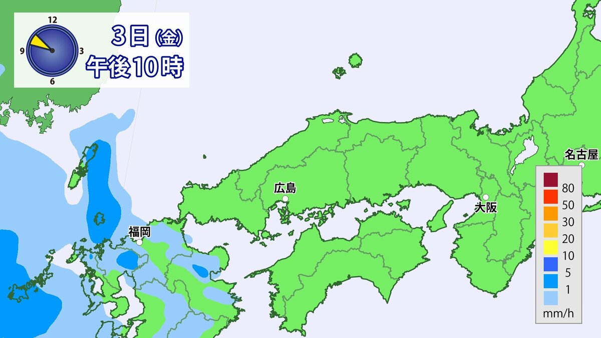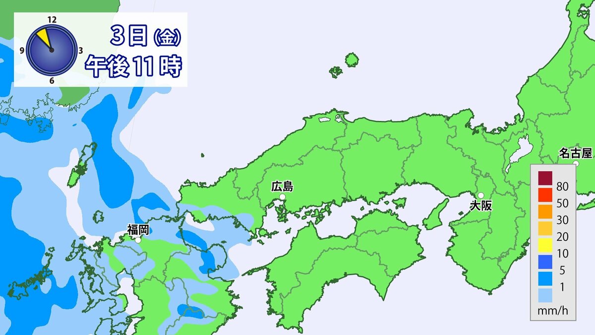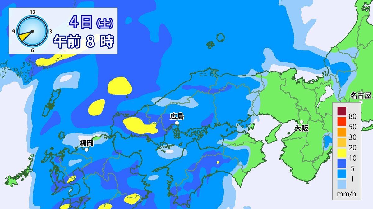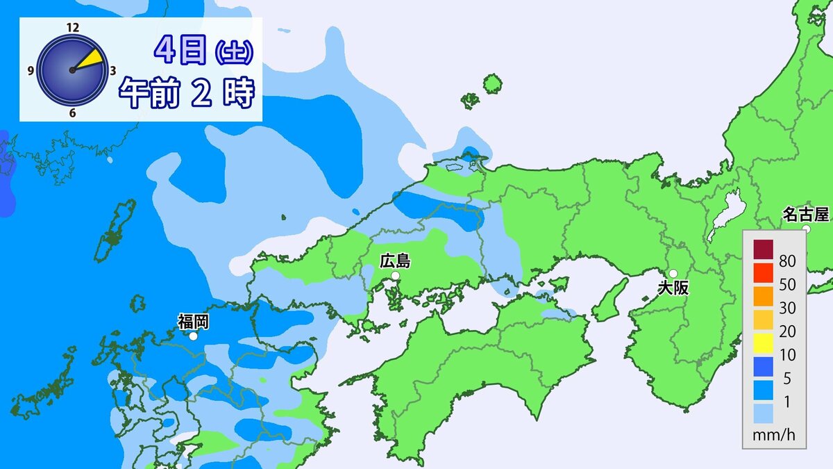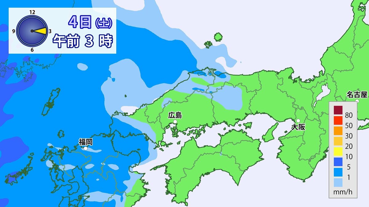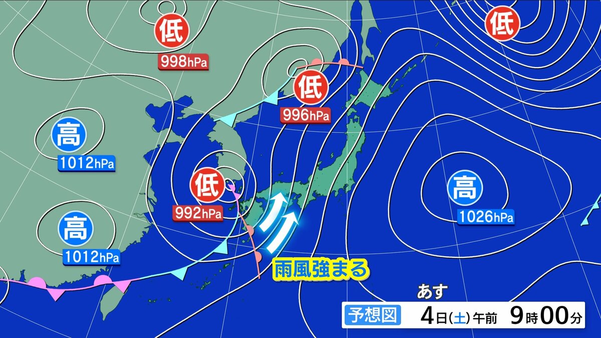 あす4日(土)は、前線や低気圧が近づき、雨や風が強まるでしょう。朝から昼過ぎにかけては雨脚が強まり、夕方からはだんだんと弱まる見込みです。夜には広くやむでしょう。風は南よりで空気は冷たくない予想です。朝の冷え込みは弱く、きょう3日(金)よりも5~7℃高い見込みです。1日の気温差は比較的小さいでしょう。