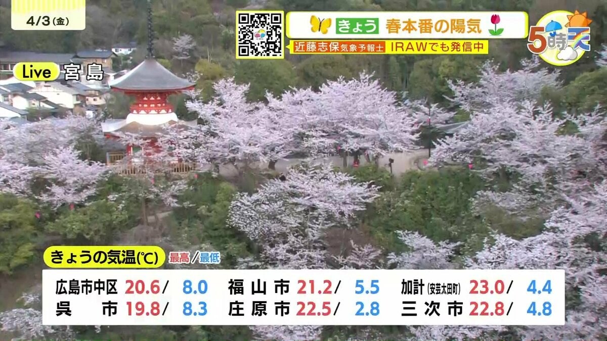 きょう3日(金)の広島県内は、よく晴れて気温が上がりました。最高気温は、安芸太田町加計で23.0℃、広島市中区で20.6℃でした。