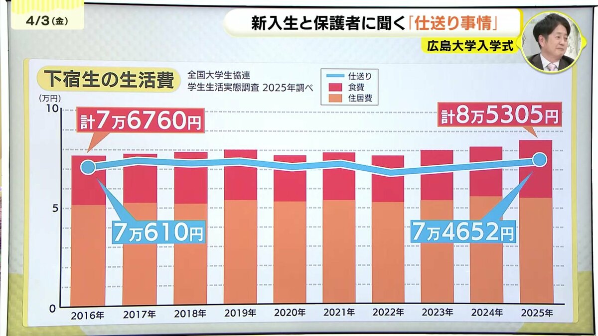 一方、仕送り金額の、10年間の推移を見てみますと、2016年に7万千円ほどだった金額は、この十年で約4千円アップしています。 ただ、生活費を見てみますと、住居費は3500円ほど、さらに食費も5千円以上上がっているのです。