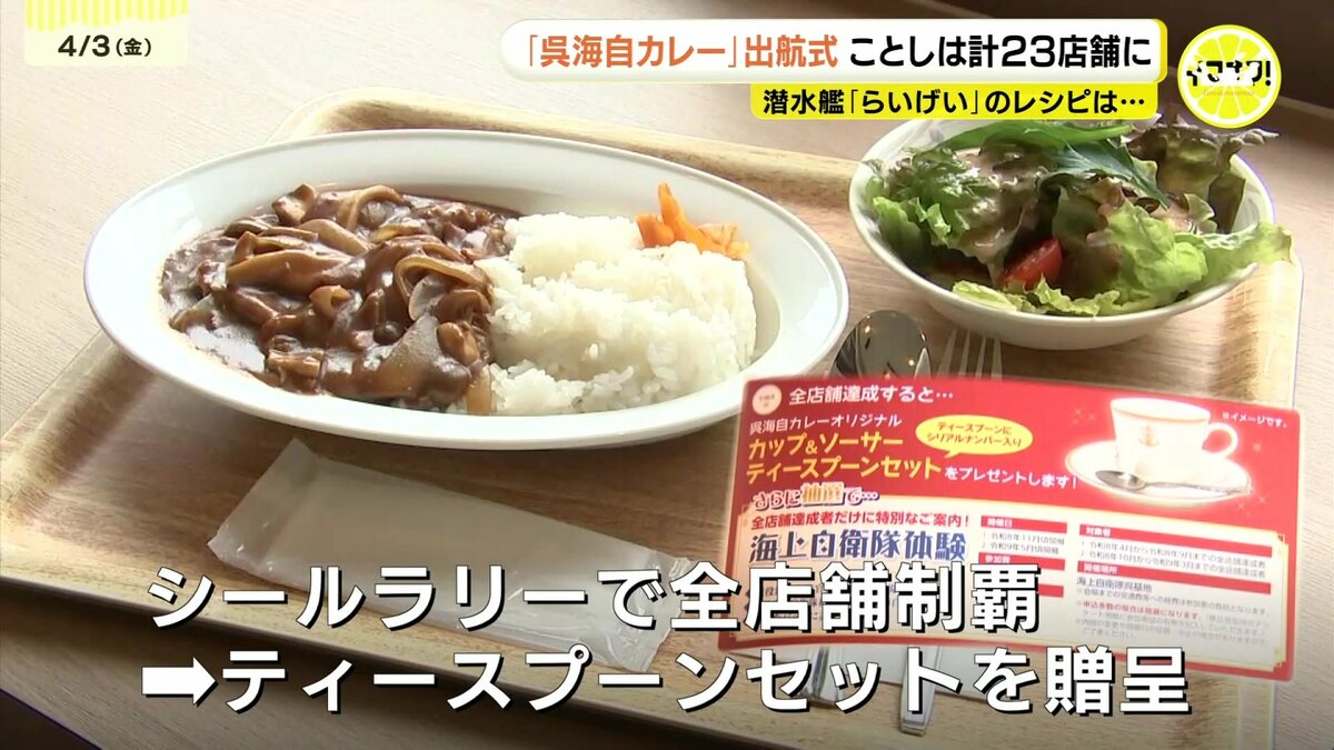 12年目を迎え新店舗も加わり、まだまだ、勢いは止まらない「呉海自カレー」。今年度は、シールラリーで全店舗を制覇すると、シリアルナンバー入りの「ティースプーンセット」が贈られるということです。