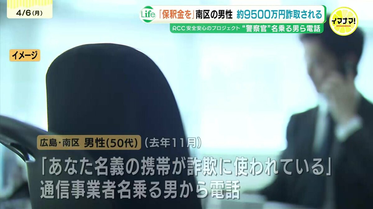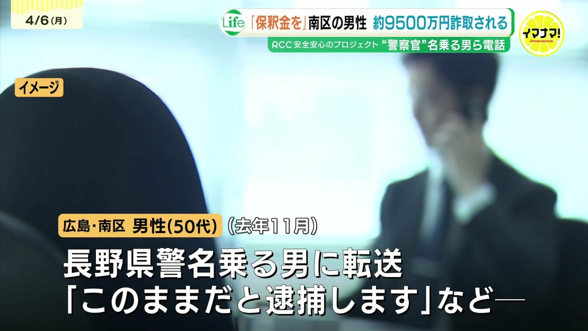 警察によりますと去年11月、広島市南区に住む男性(50代)のもとに「あなたの名義で携帯電話を契約した人がいる」「その携帯電話が詐欺に使われている」などと通信事業者を名乗る男から電話がありました。