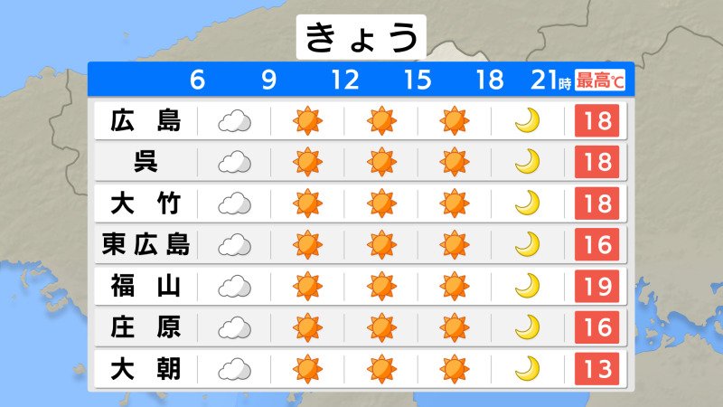 朝の最低気温は、きのうよりも冷え込みが弱まり広島市中区12.8℃・庄原市8.9℃などでした。