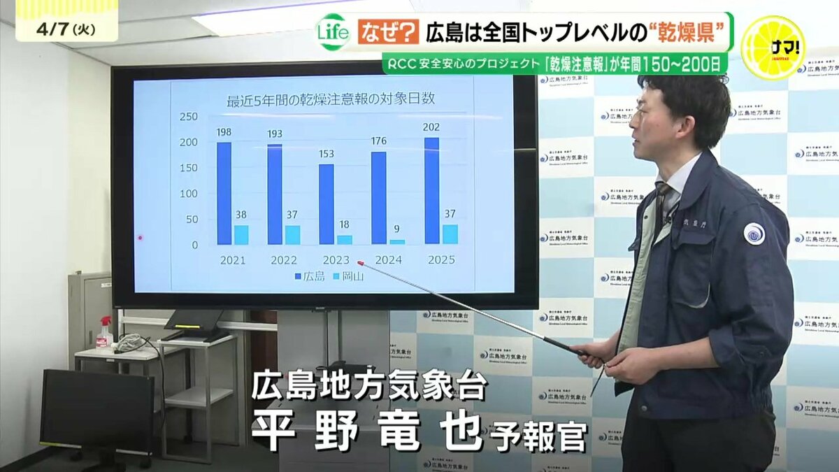 「広島県南部は乾燥注意報の発表が非常に多い地域になっています、広島県は年間の半分は乾燥注意報が出ている」