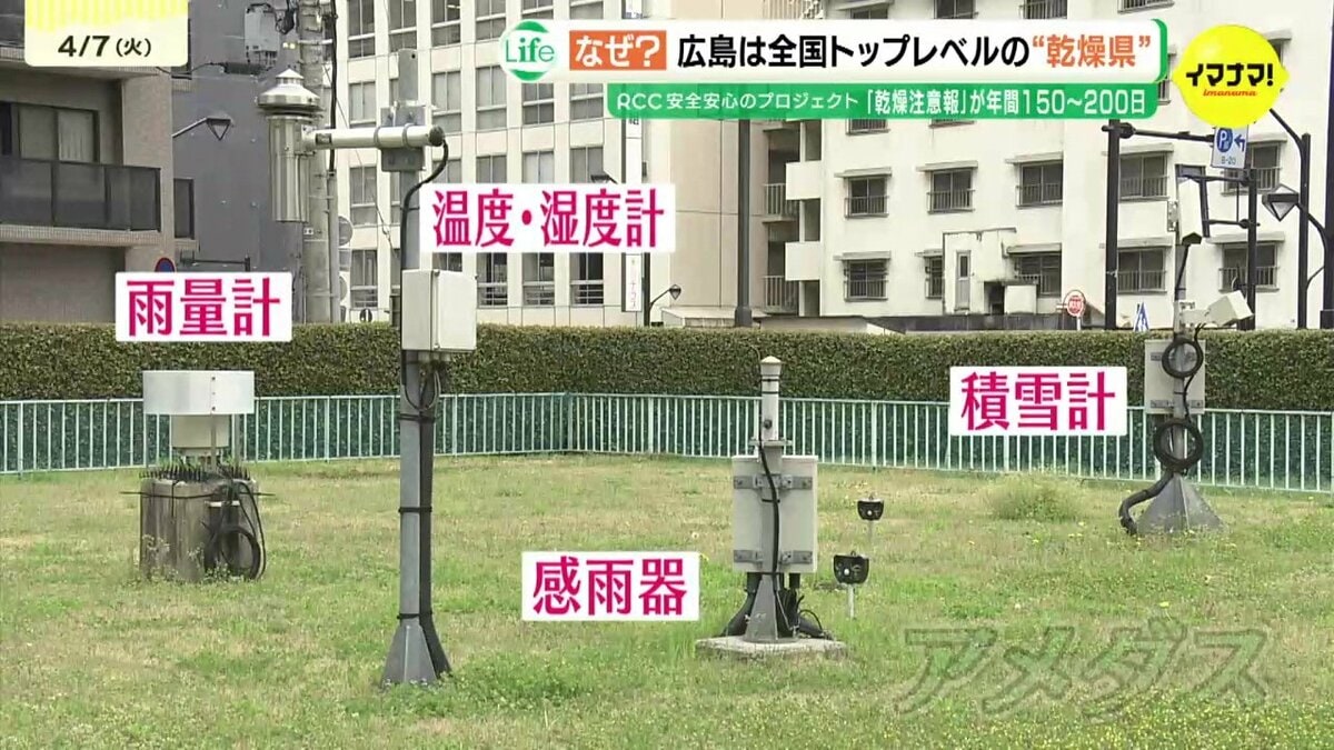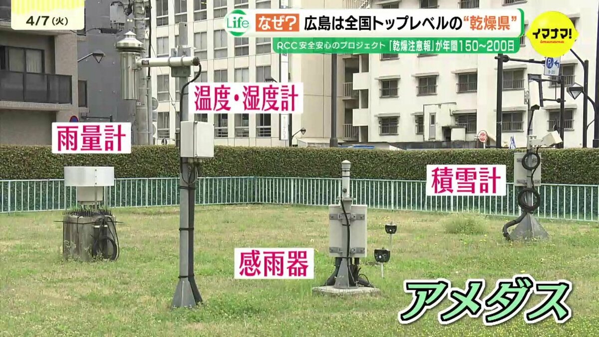 広島地方気象台に設置されている観測システム=アメダス。広島市中区の気象データを測っています。乾燥注意報は、「最小湿度」と数日前からの乾燥具合を示す指標の「実効湿度」を用いて火災の危険が大きいと予想される場合に発表されます。その発表基準は、過去の災害の発生状況などと照らし合わせて地域ごとに決められています。