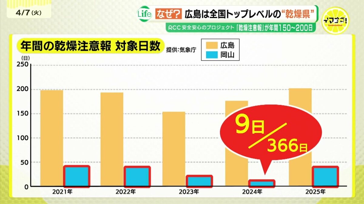 1年のうち「乾燥注意報」が対象になった日数は、過去5年間で広島が150から200日ほどなのに対して、同じ瀬戸内エリアの岡山は40日を下回り、2024年は9日にとどまっています。