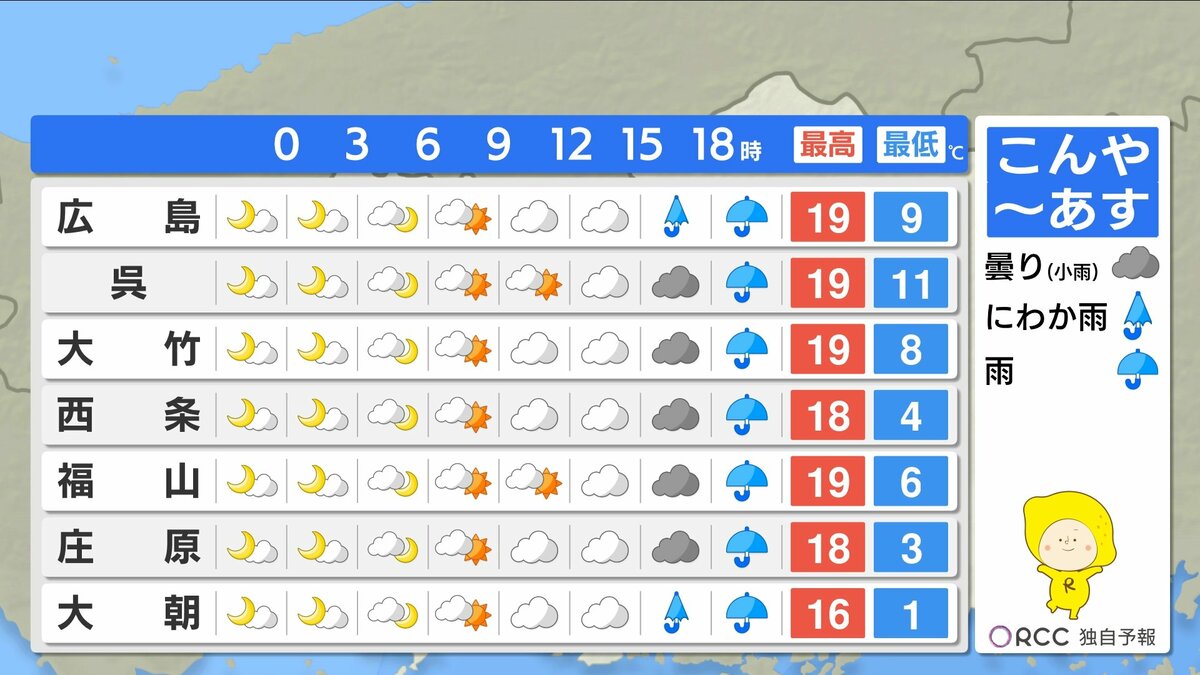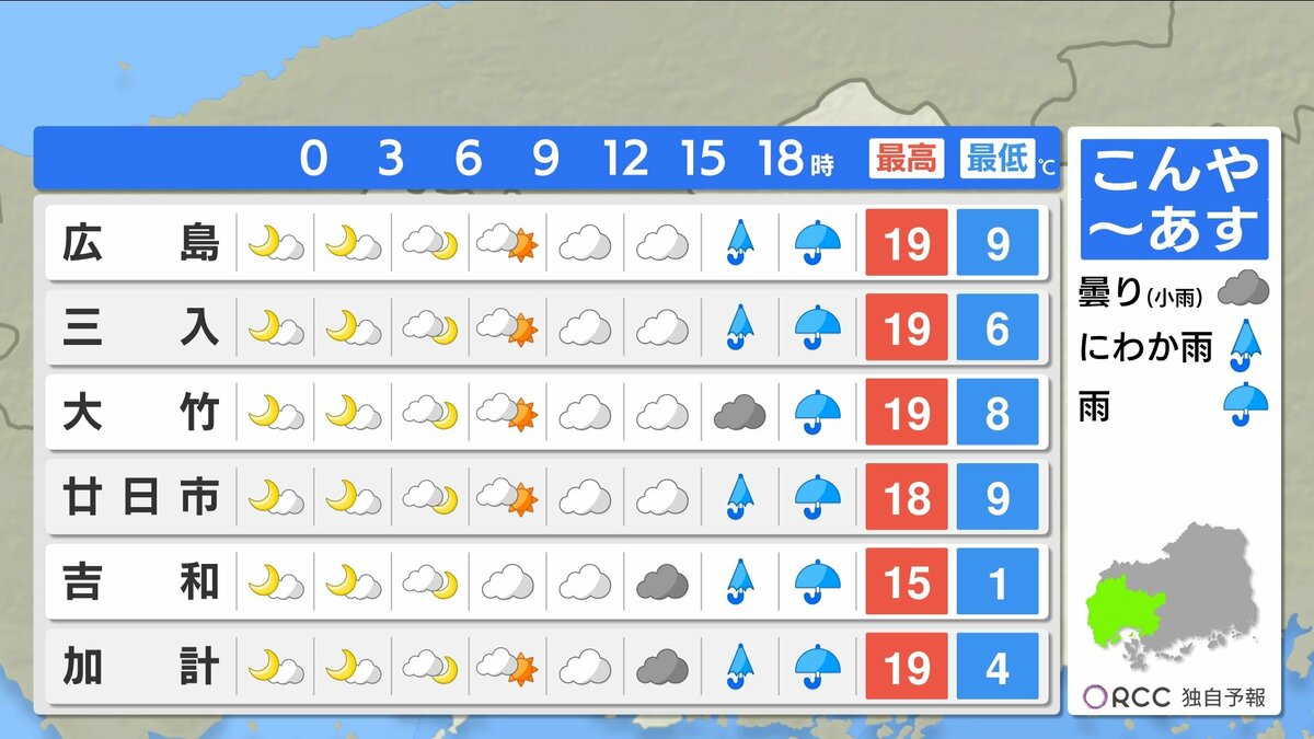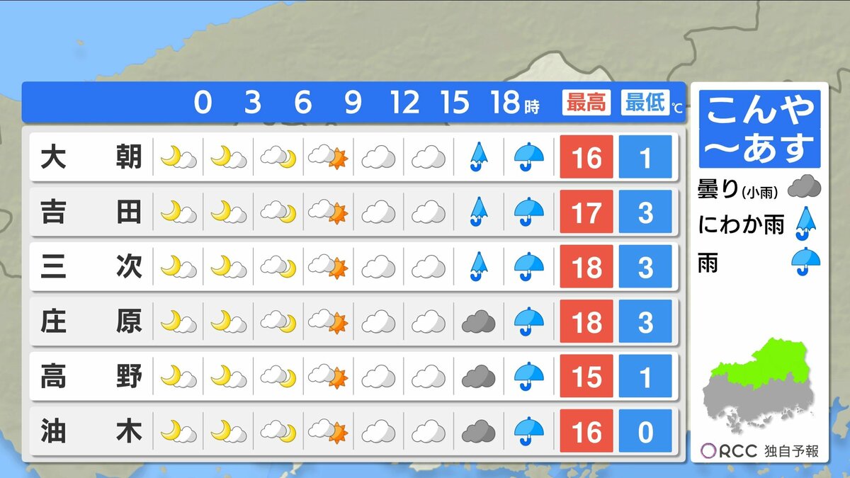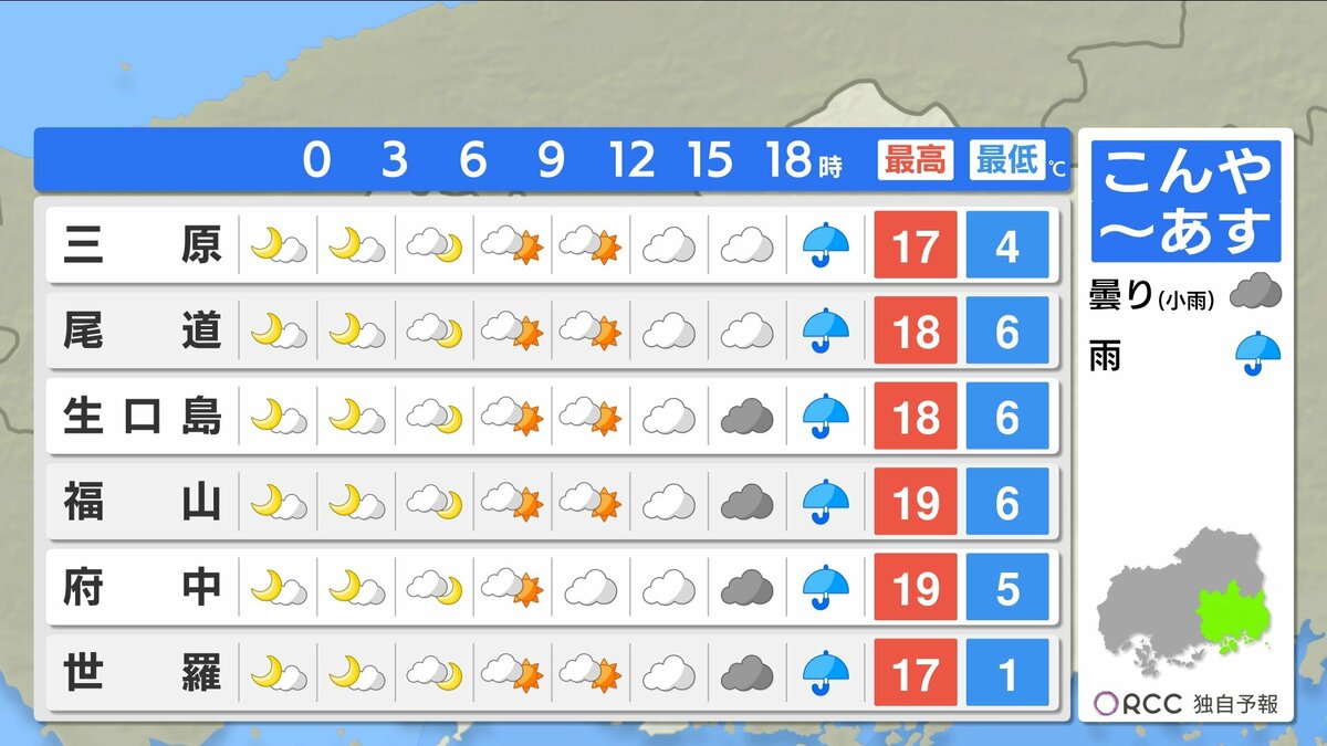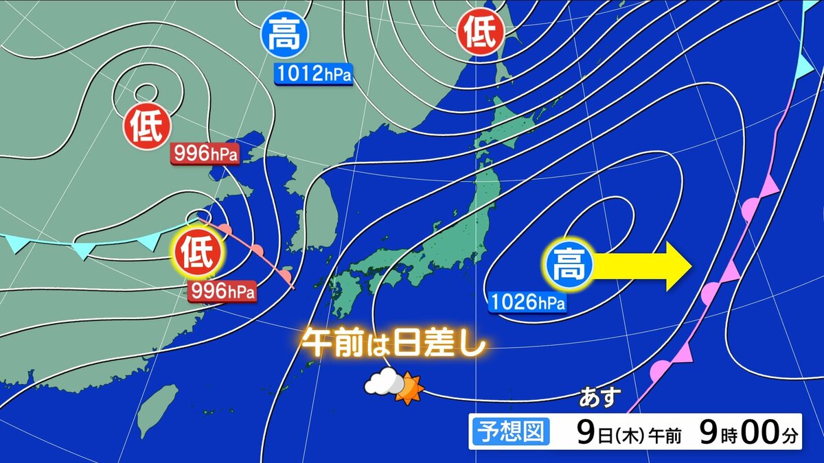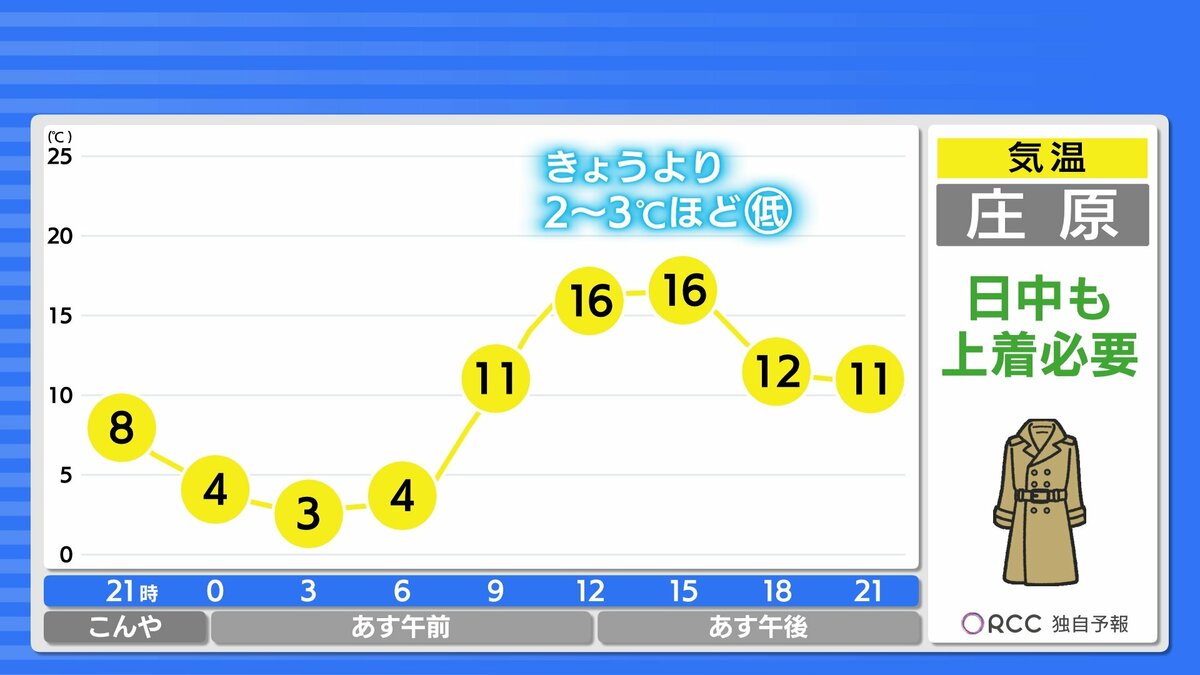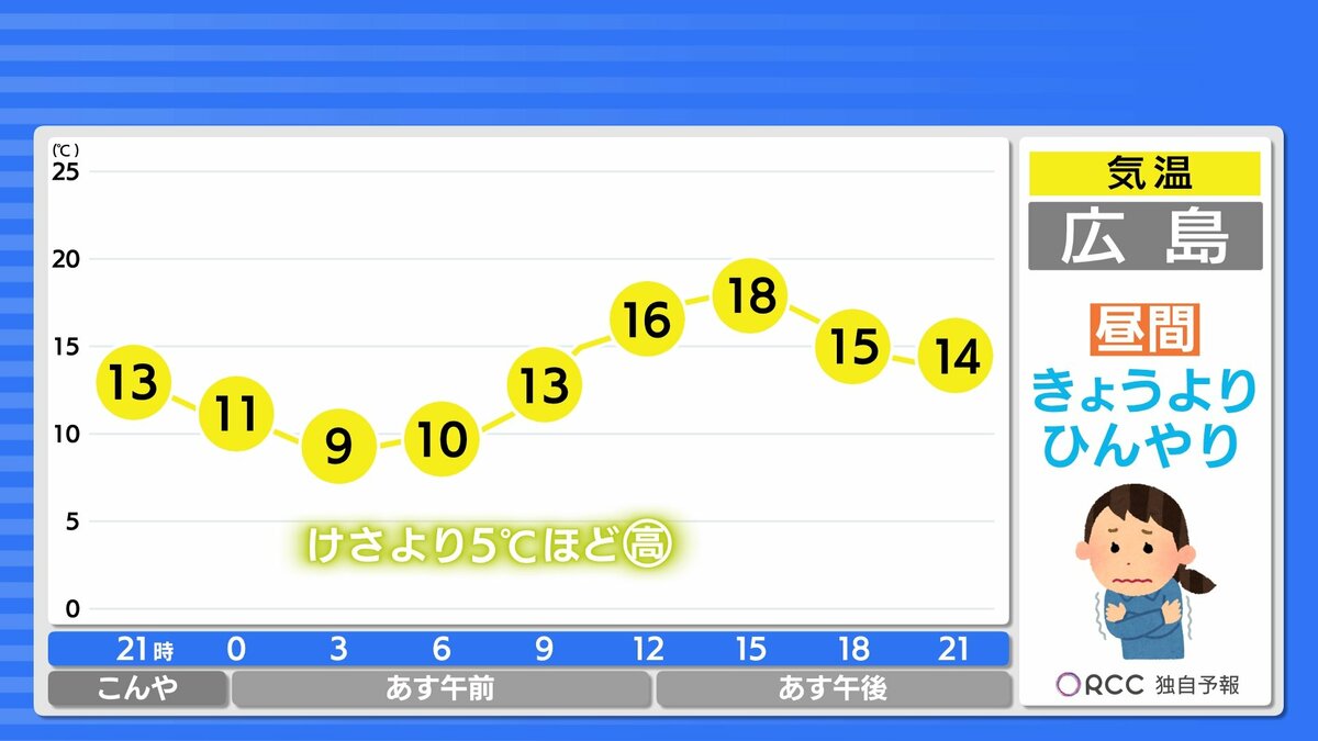 朝の冷え込みはけさより緩みますが、それでも沿岸部で1ケタの冷え込みの地点が多いでしょう。あすの朝も厚手の上着があった方が良いでしょう。日中の気温は、きょうよりやや高い所が多いですが、日差しが届きにくく気温ほどの暖かさは感じにくいかもしれません。