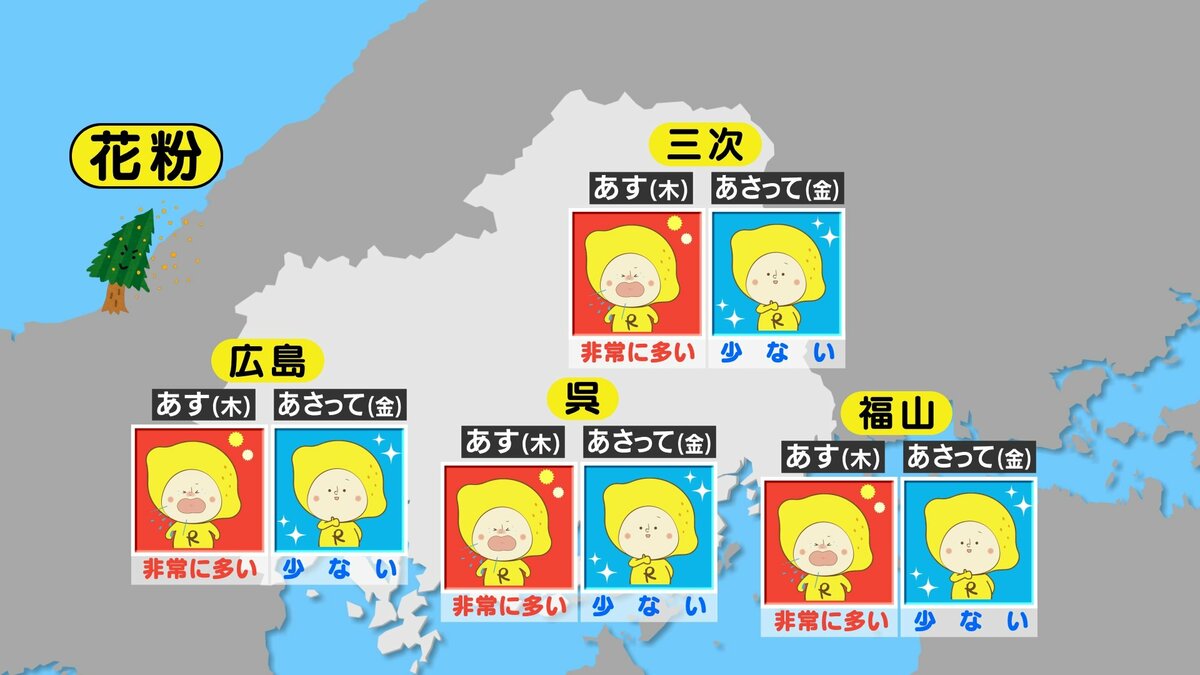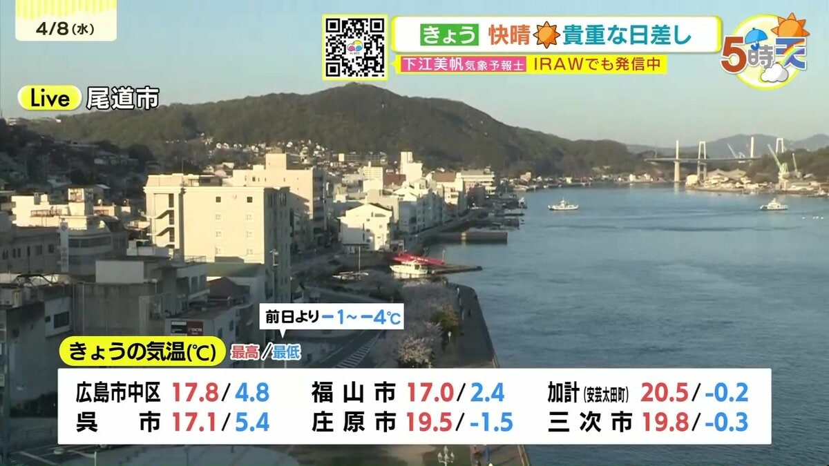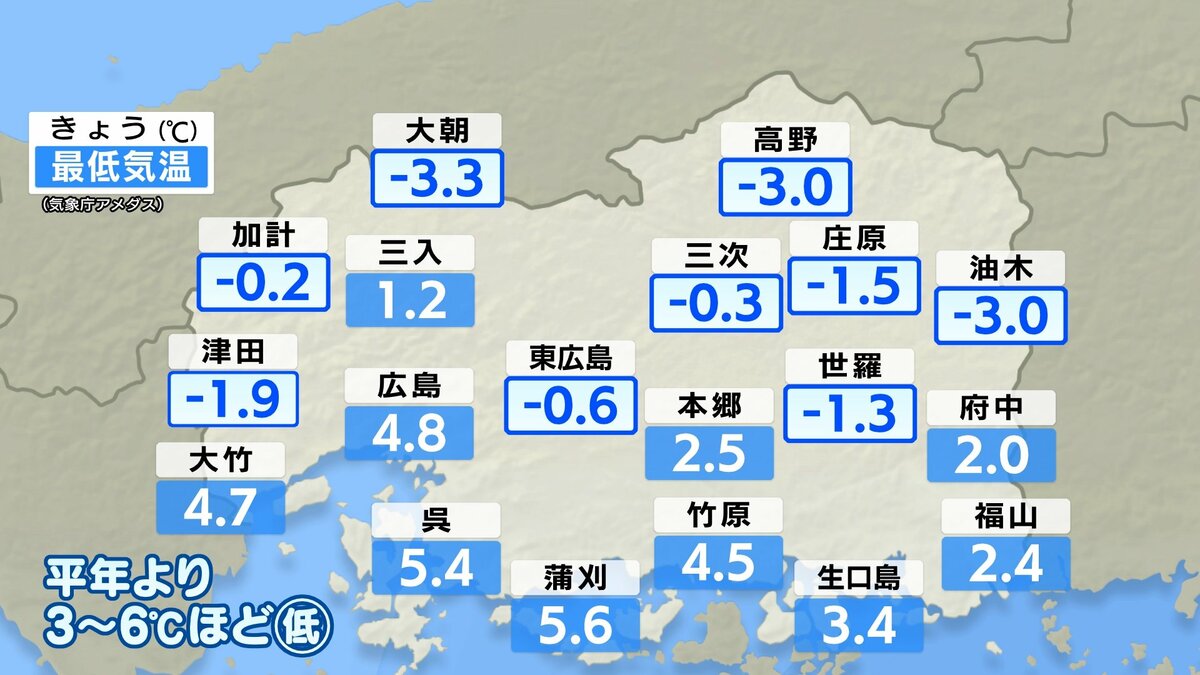 きょう8日(水)の広島県内は、高気圧に覆われ快晴の一日でした。放射冷却が効き、朝の冷え込みがかなり強まりました。最低気温は、県内9地点で氷点下を記録し、平年を3℃~6℃ほど下回りました。一日の寒暖差が大きくなっています。