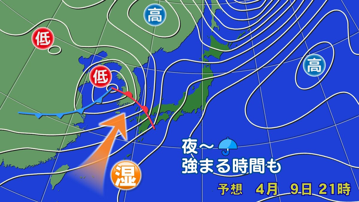 午前中は高気圧の圏内で日差しが届きますが、前線上の低気圧が日本海を進み、前線が本州付近を通過します。前線や低気圧に向かって暖かく湿った空気が流れ込みやすく、次第に天気が下り坂です。夕方以降雨が降り始め、夜には広く雨が降る見込みです。雨脚が強まる時間帯があるでしょう。