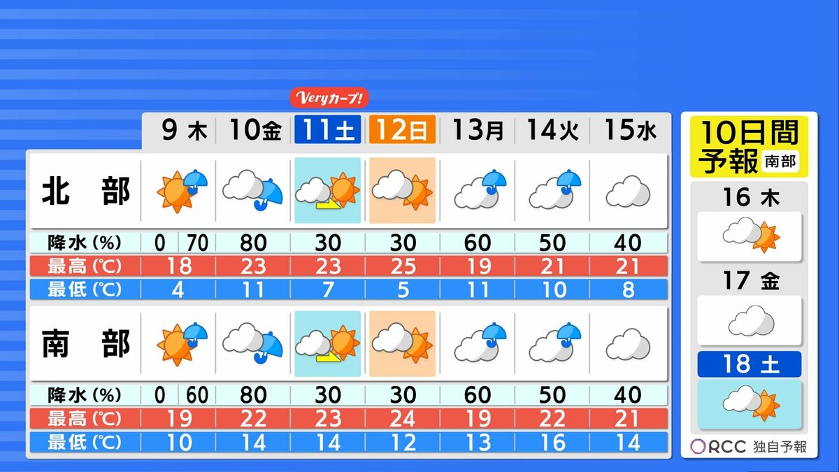 引き続き天気は周期変化するでしょう。週末は日差しが復活し初夏の陽気になるでしょう。少し動くと汗ばむ体感となりそうです。南部では朝晩の冷え込みも緩んでくるでしょう。