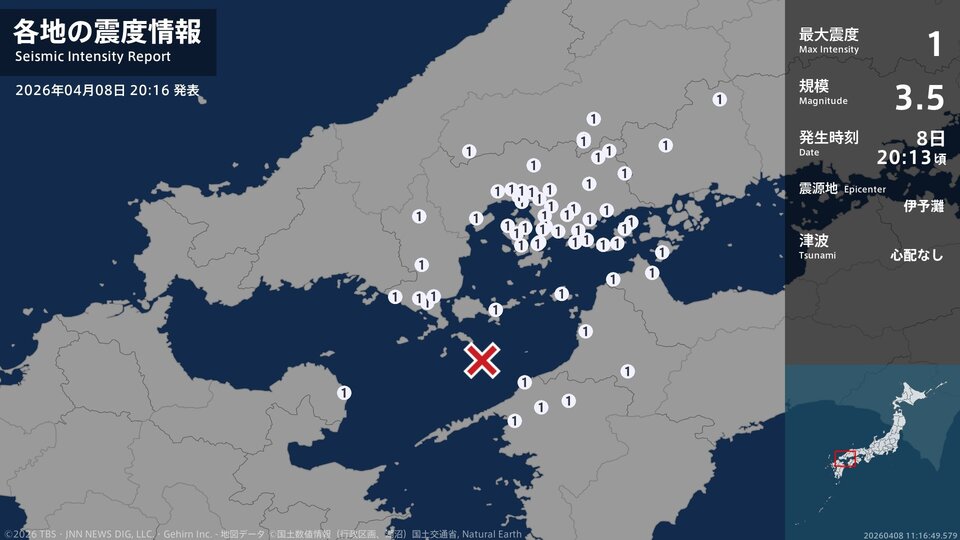 気象庁によりますと、震源地は伊予灘で、震源の深さはおよそ50km、地震の規模を示すマグニチュードは3.5と推定されます。