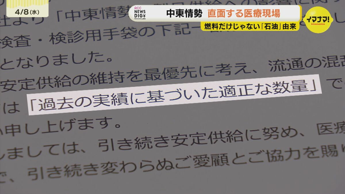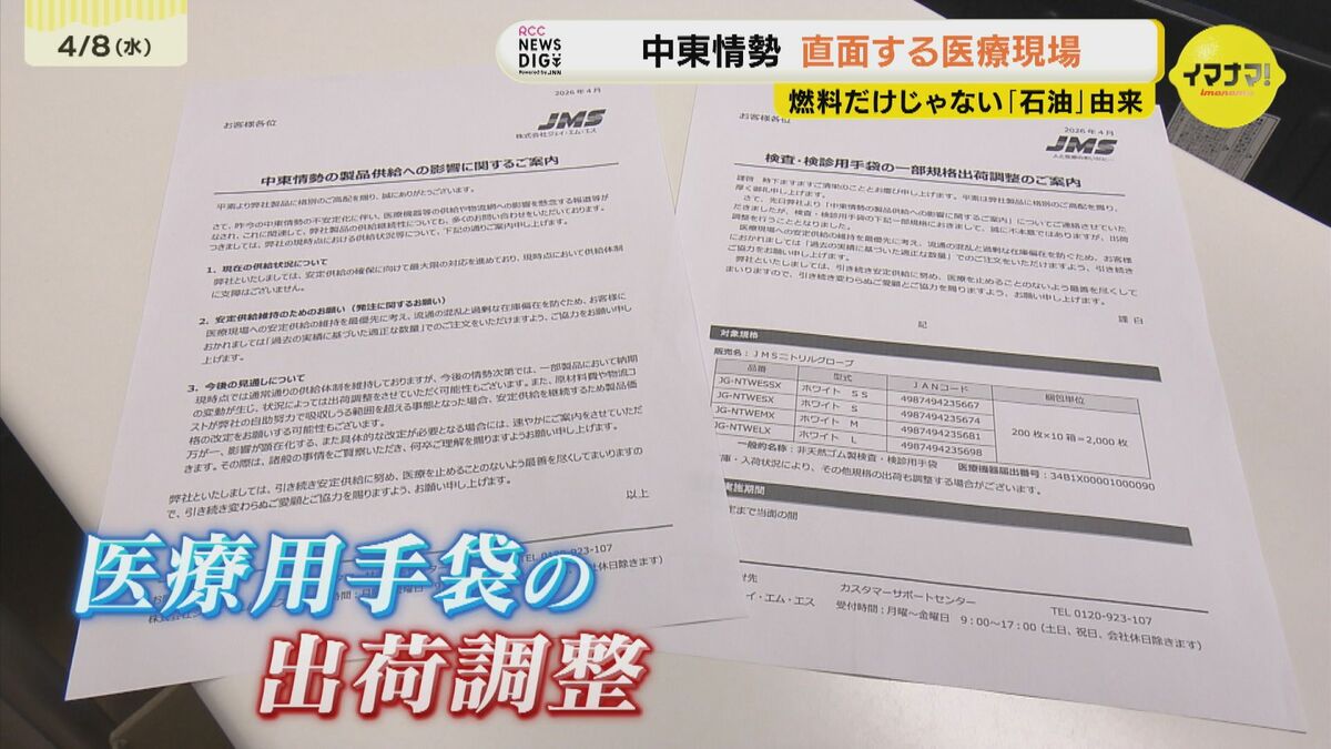 ただちに供給が止まることはないものの、すでに感染対策に欠かせない「医療用手袋」には出荷調整がかかっています。流通の混乱を防ぐため、当面の間は、適正な数量での注文が求められています。