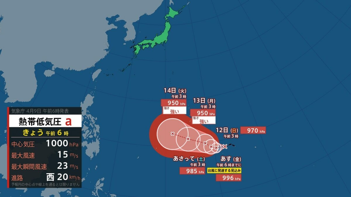日本の南に熱帯低気圧が発生しました。24時間以内に台風へ発達する見込みです。9日6時現在、トラック諸島近海を時速20kmの速さで西へ進んでいます。今後の気象庁から発表される最新情報を確認するようにしてください。