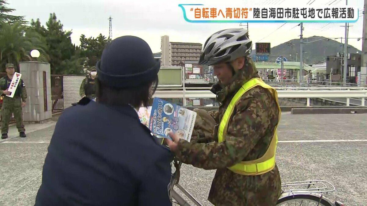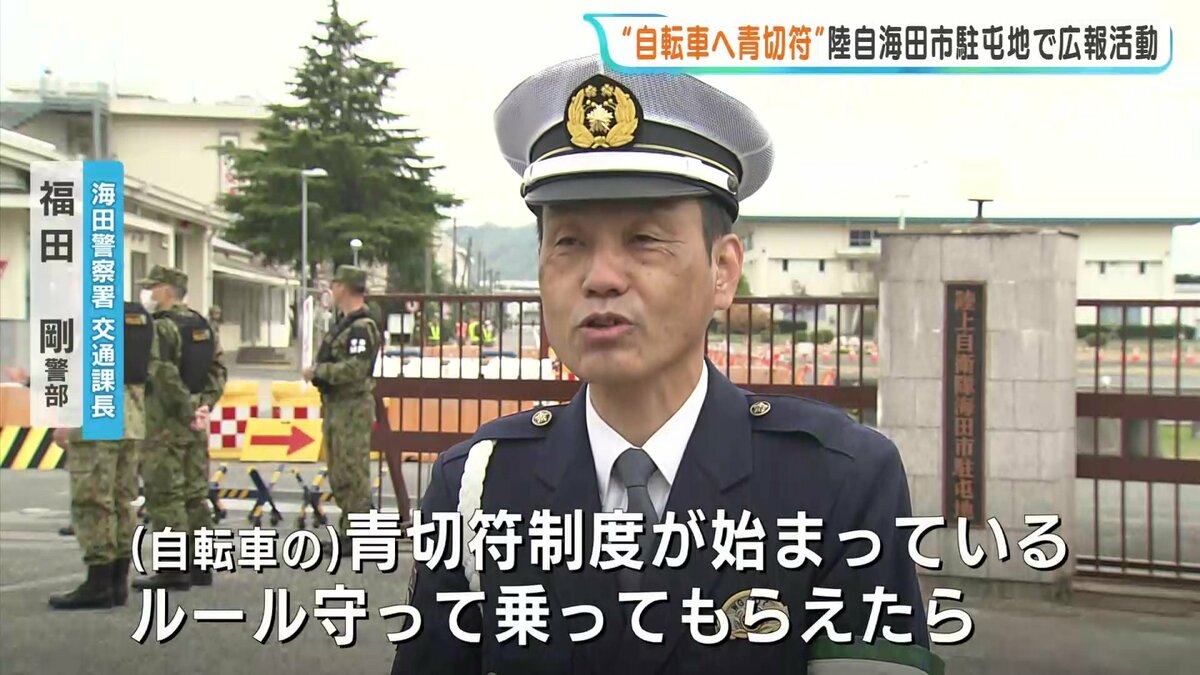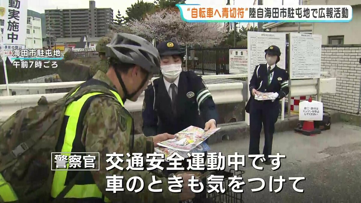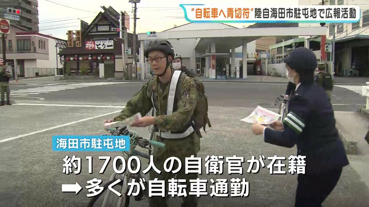 その自衛官たちに向け、今月から導入された自転車の青切符などに関するチラシを配りました。
