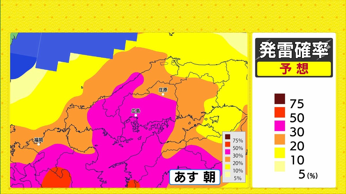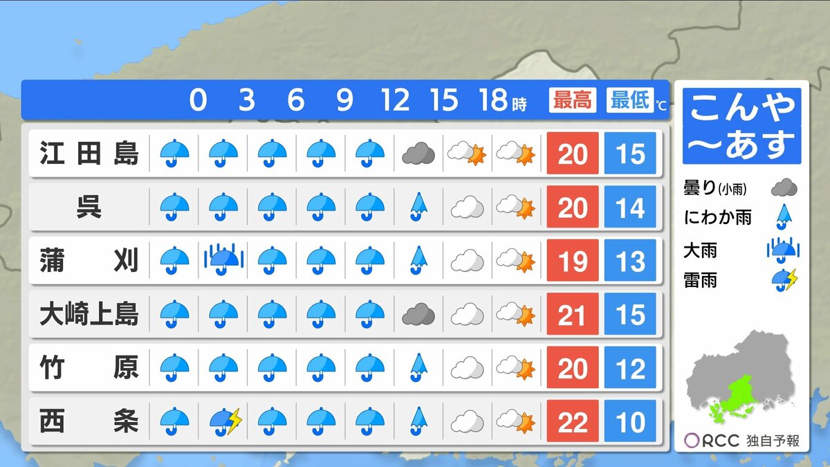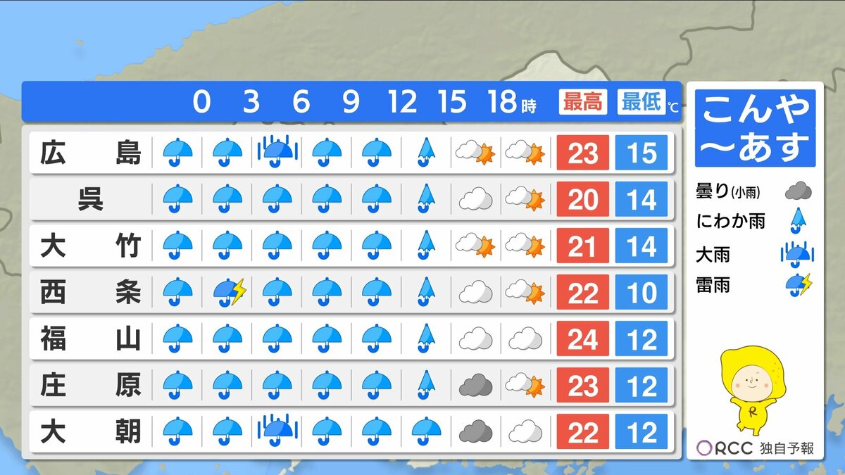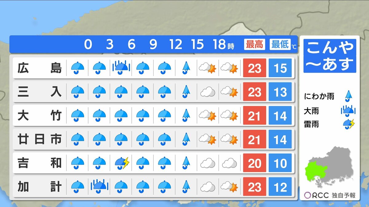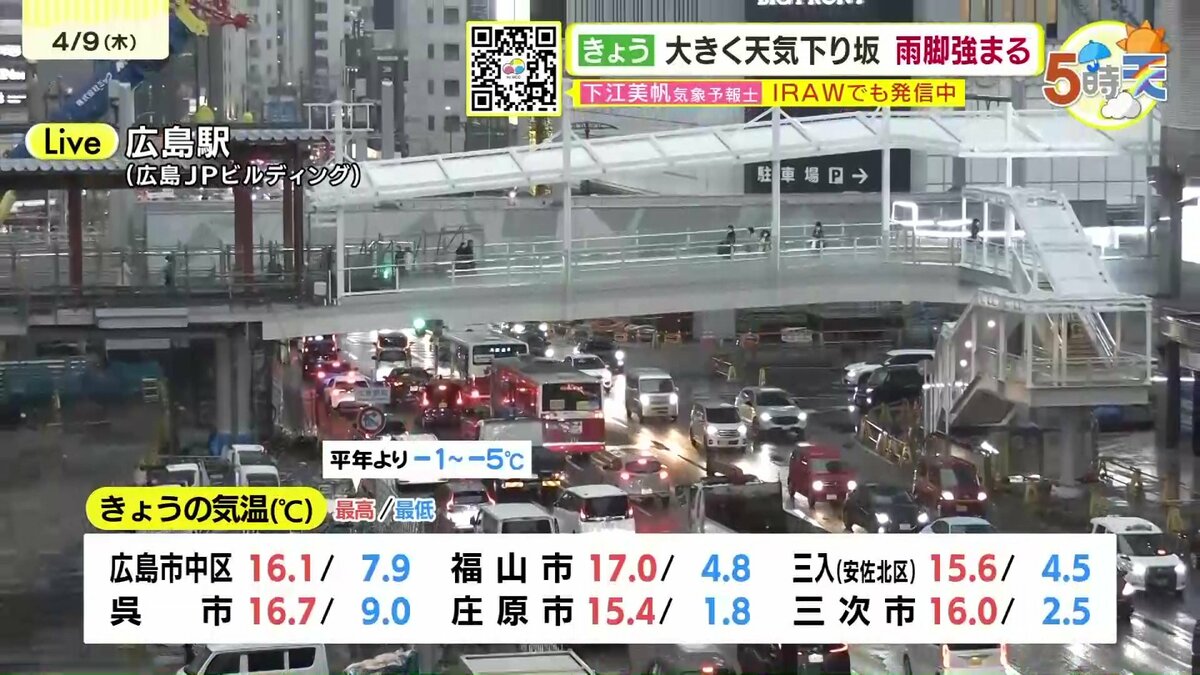 きょう9日(木)の広島県内は、朝から雨が降った所があり、夕方以降再び大きく天気が崩れ、雷を伴い雨脚が強まりました。日中の気温は平年より1℃~5℃ほど低くなり、空気がひんやりした一日でした。