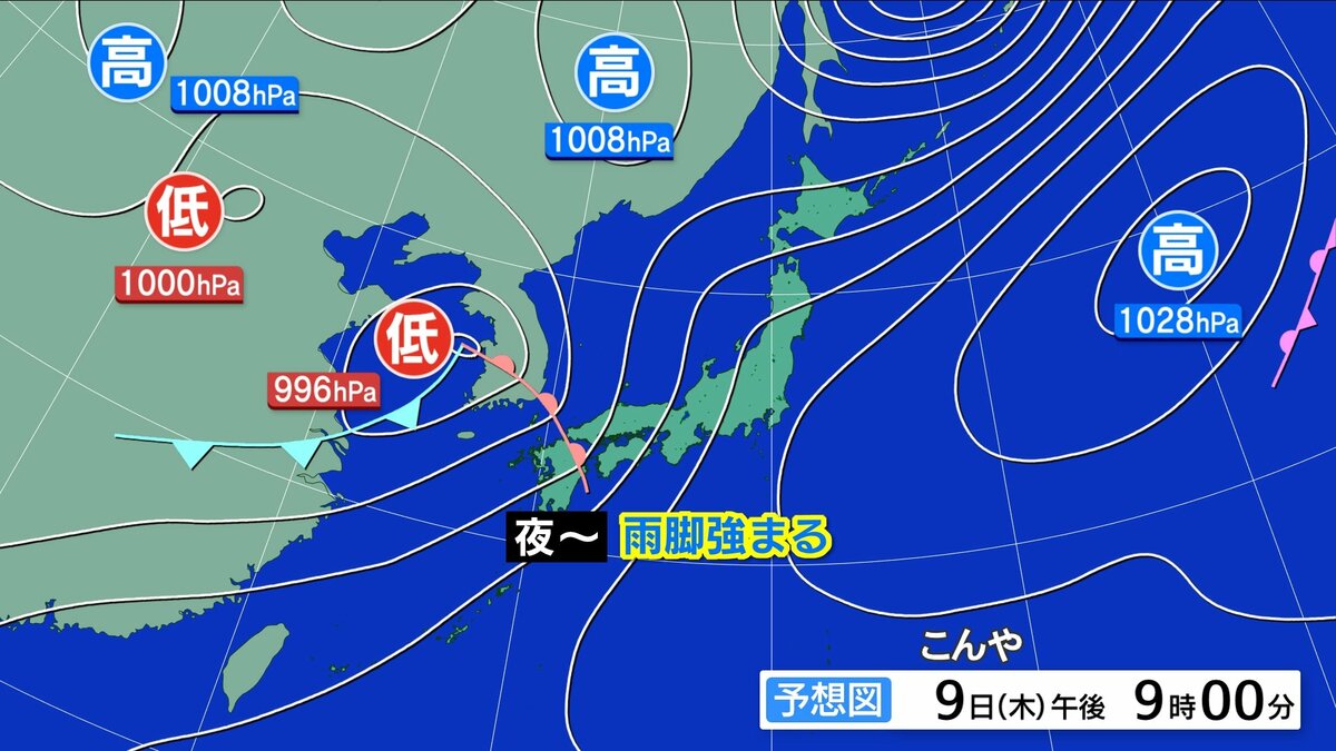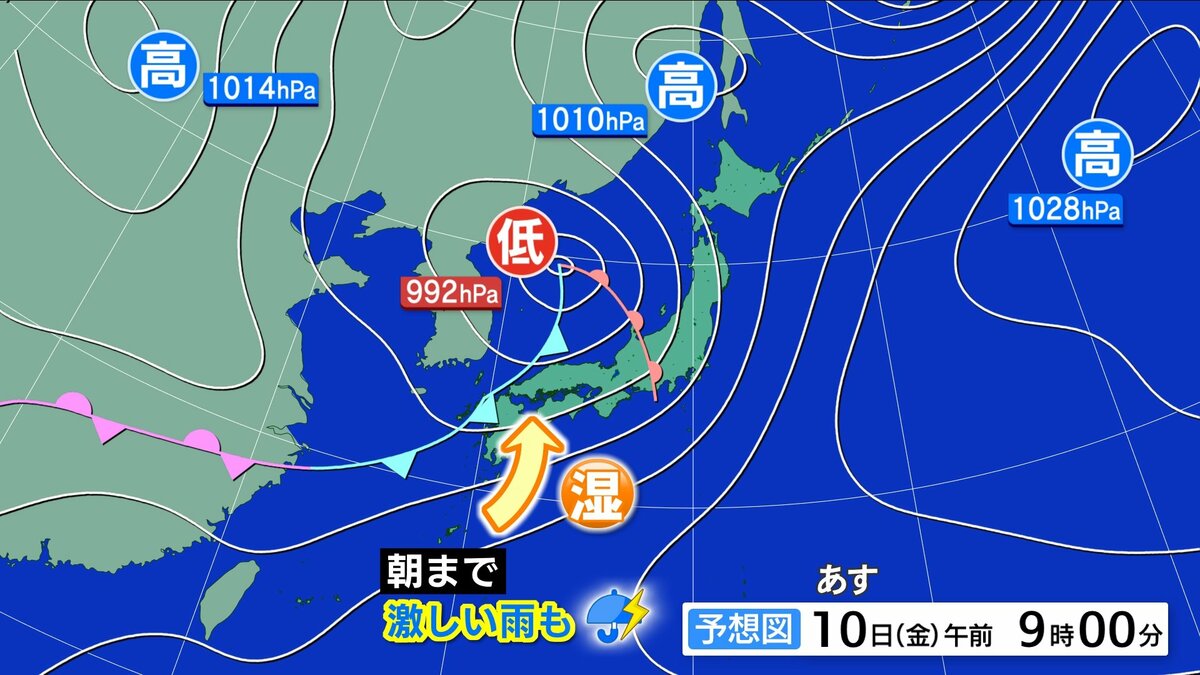 前線上の低気圧が日本海を進み、前線や低気圧に向かって暖かく湿った空気が流れ込みます。夕方にかけて大気の状態が非常に不安定で、落雷や突風に注意が必要です。雨のピークは未明から朝にかけてになるでしょう。所によっては雷を伴い激しい雨が降る見込みです。