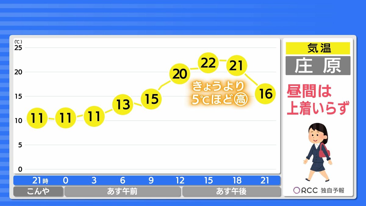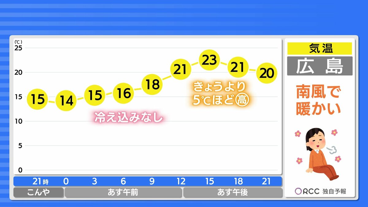 雨が降り、朝の冷え込みはほとんどありません。日中の気温は20℃を大きく超える所が多く、前線や低気圧に向かって南風が吹くため、暖かい一日になりそうです。