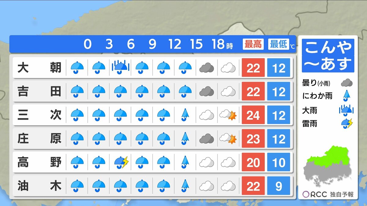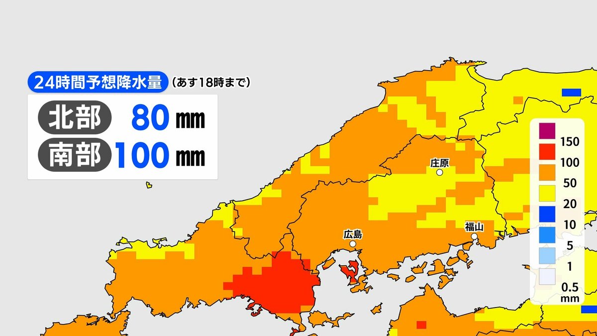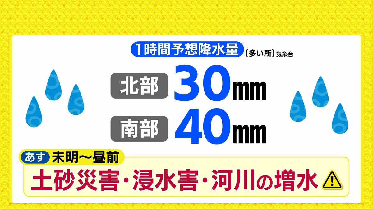 気象台が発表しているあす18時までの24時間予想降水量は、多い所で北部 80ミリ 南部100ミリとなっています。あすの昼前にかけて土砂災害や河川の増水・低い土地の浸水に注意が必要です。