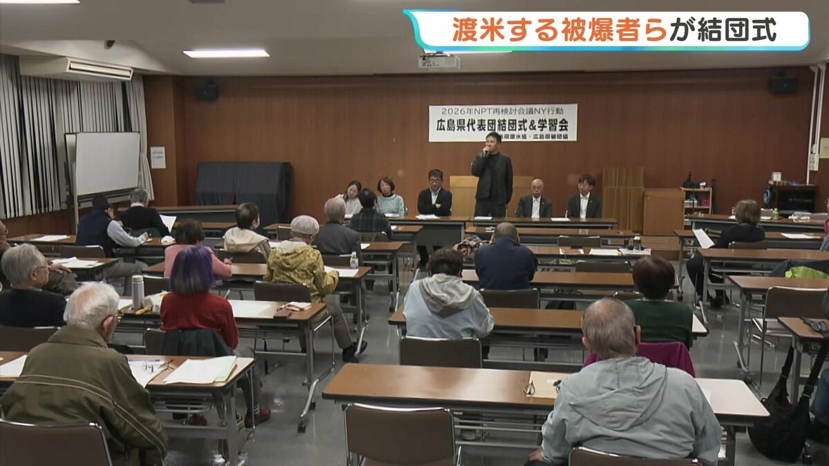 9日夜に行われた結団式には、現地に渡る6人など30人が参加しました。一行は、県原水協の代表として、27日からアメリカ・ニューヨークの国連本部で開かれる、NPT=核拡散防止条約の再検討会議に合わせて渡米します。現地では、会議の傍聴や各国代表へのロビー活動のほか、ニューヨーク市街地でのパレードや、現地の学校での被爆証言なども予定されています。