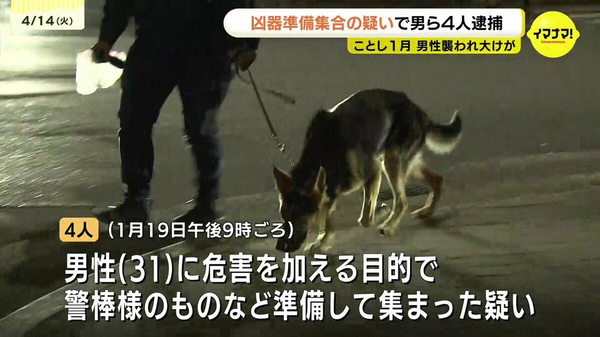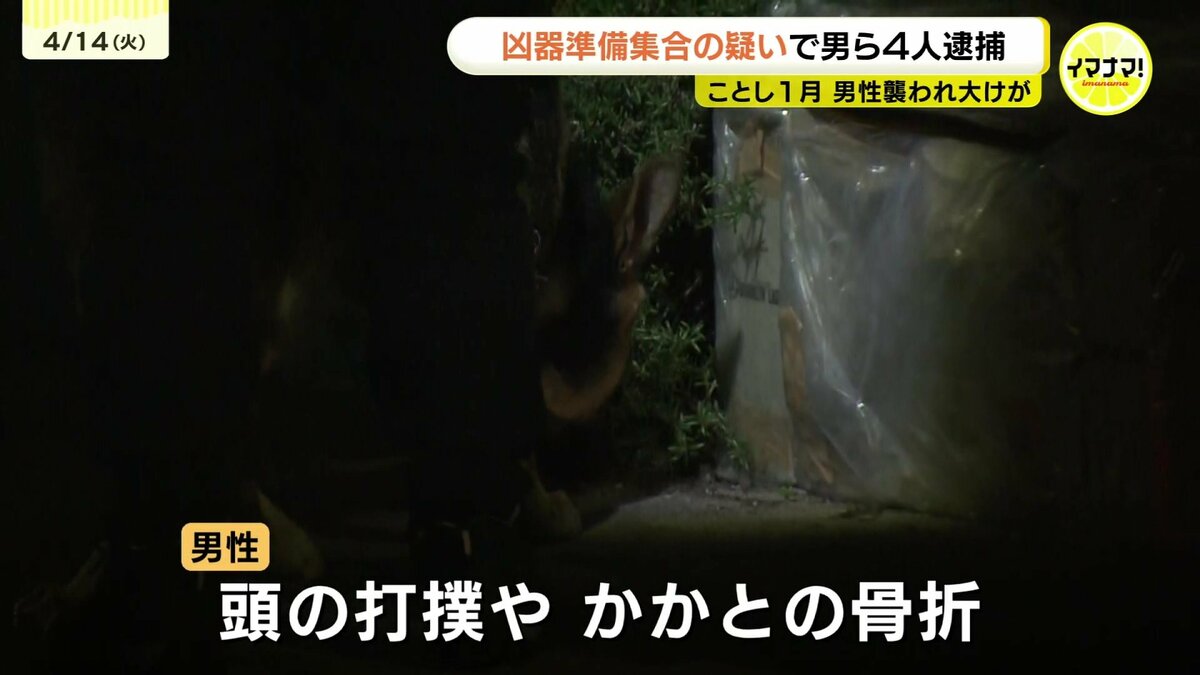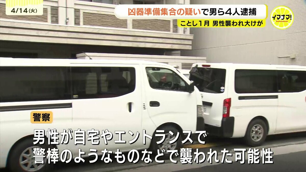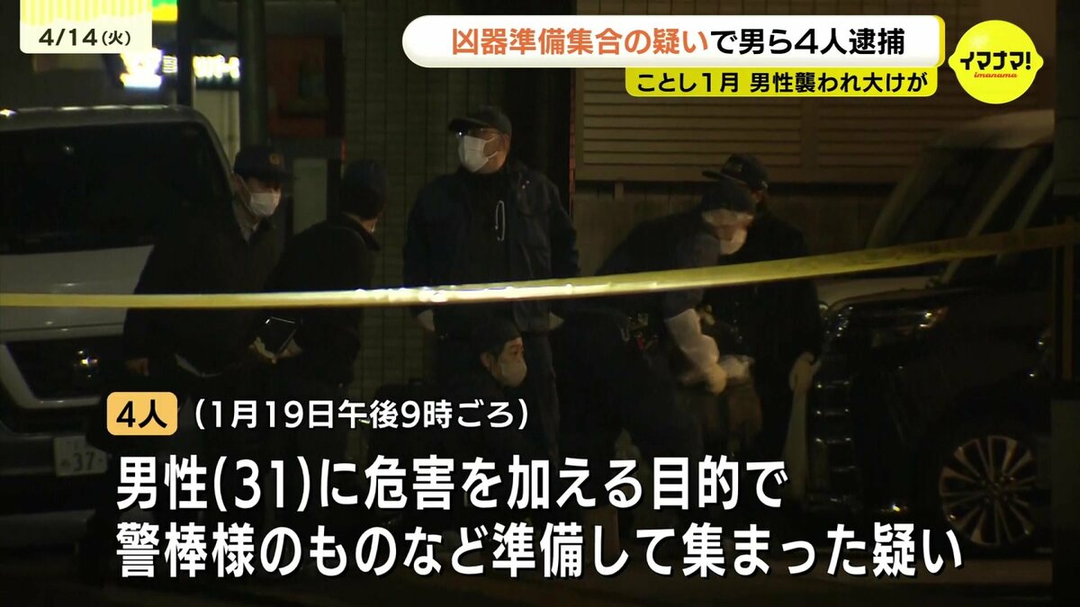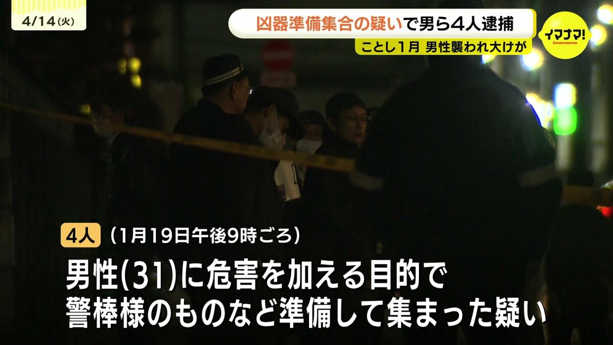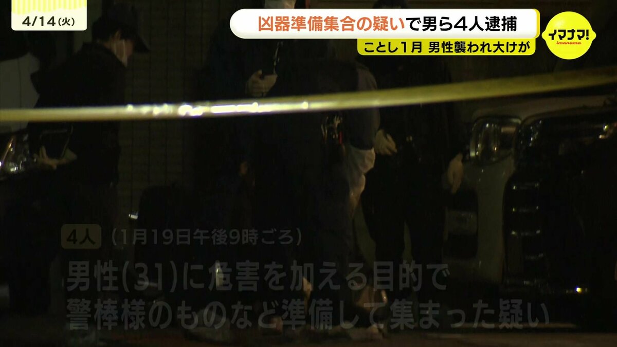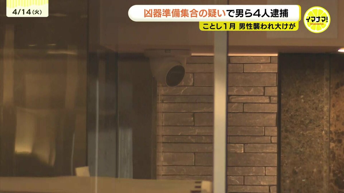 1月、広島市中区のマンションで男性が襲われた事件で、警察は14日、凶器を持って集まった疑いで男ら4人を逮捕しました。